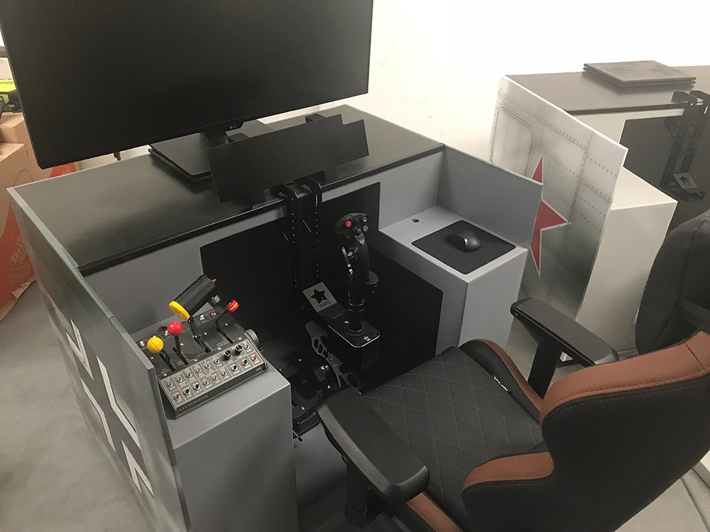 Jason has been busy, in addition to moving to the Las Vegas area, getting together some materials for the booths including these really cool desk setups. Controls are being provided by VIRPIL, GVL Custom Throttles, MFG Simundza, and RapidX.