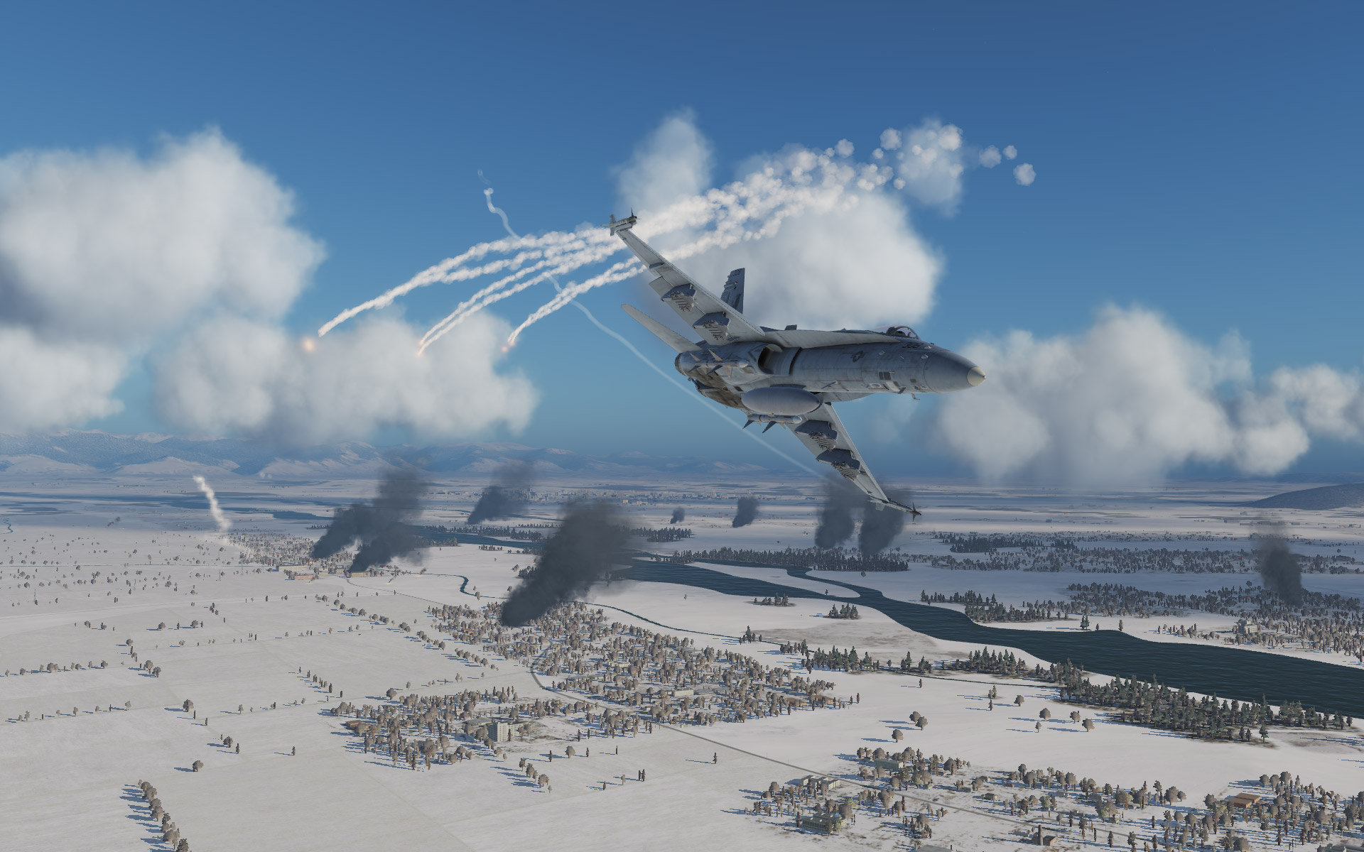 The first part of this mission goes off without a hitch nearly every time I’ve played it. I launch from the deck of the USS John C. Stennis on a close air support mission in Georgia in the town of Zeni where Russian forces are attempting to cross the river. Armored units are the target and our F/A-18Cs are equipped with Sparrow and Sidewinders for self defense as well as Mk-20 cluster munitions.