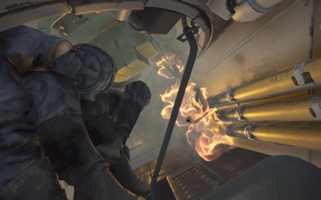 Below you’ll see the damage to the front of my tank. Its pock marked from several hits though its never really clear where the hits all came from. On the interior there’s far less guesswork. In the following shots you can see that my gunner is slumped over (clearly taking a nap despite the serious situation) and that there’s fire in the cabin followed by the fire extinguisher knocking the fire down. It’s a very cool level of immersion and one that 1CGS has indicated they will be bringing to aircraft in the future.