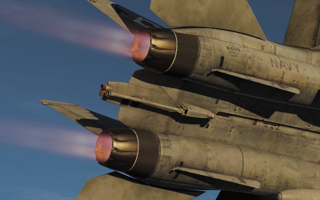 In a recent Open Beta, the F-14B afterburner effects disappeared or had visual difficulties. This appears to have since been fixed although on my DCS World Open Beta install I see some further graphical artifacting near the engine nozzles that wasn’t there previously.