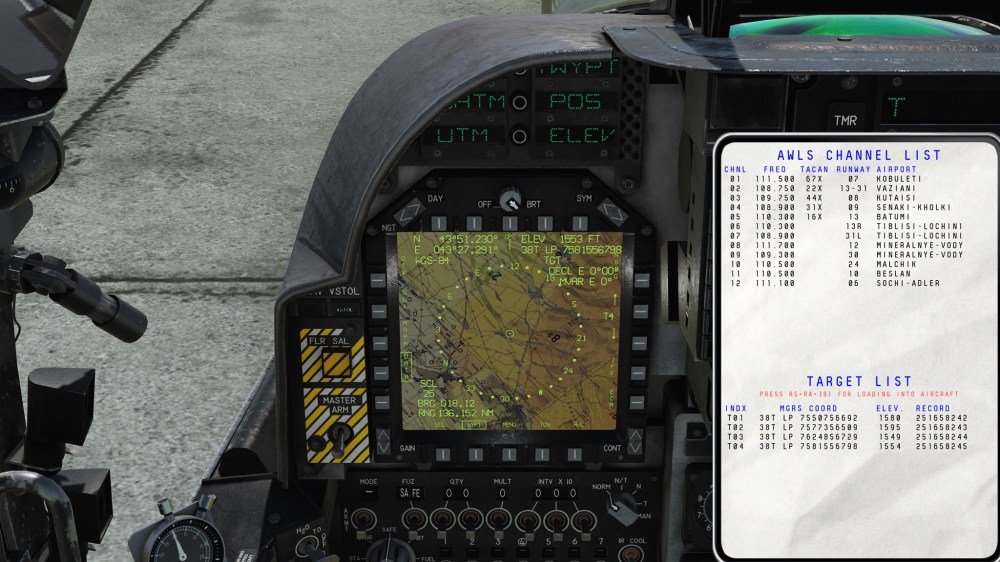 The other feature that RAZBAM is working on is using the F10 screen plus the kneeboard to provide some pre-loading JDAM GPS coordinate information. This appears to allow you to designate targets appearing on the F10 map into the AV-8B’s computers during the pre-flight process. The kneeboard is used to verify that the targets are loaded and then can be cycled through on the MFD.