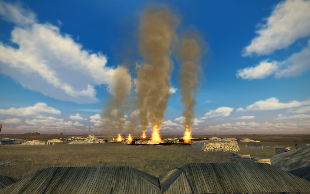 The reason? Well, we hit several structures but missed the artillery, trucks and armored vehicles on the outsides of the enemy position. Our aim was almost too precise with all eight bombs falling within the same zone.