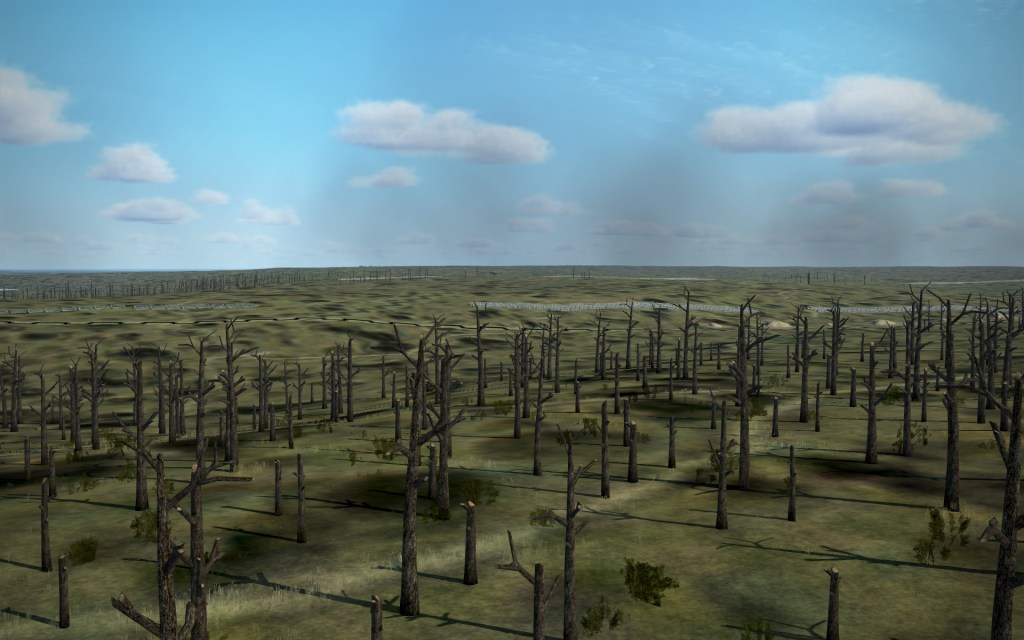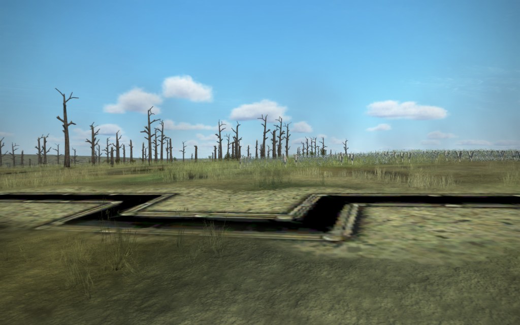 That minor mark against is hardly a show stopper even just for this one area on the map. Dust clouds dominate the area from some vantage points, the occasional large explosion from artillery over the area show off the devastating effects of the war going on, and the shattered remains of defoliated trees look pretty good too. On the whole, it’s convincing, and throw in some aircraft above and plenty of active flak and artillery cannons on either side and this scene should start to come alive.
