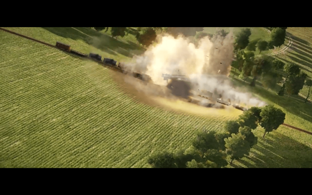 A few possibly new effects caught my eye as well. First, in a couple of scenes a train blows up after being strafed by attacking fighters. I don’t remember seeing this effect in DCS previously. The F/A-18C doing an evening launch also seem to have what might be some new afterburner effects. Finally, a couple of scenes (not captured below) also seem to showcase some possibly new lighting effects from rockets being fired by ground vehicles.