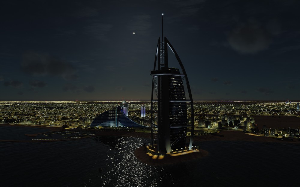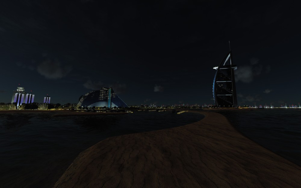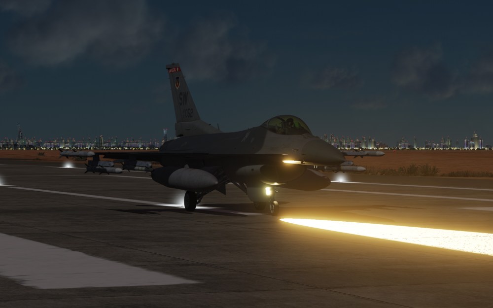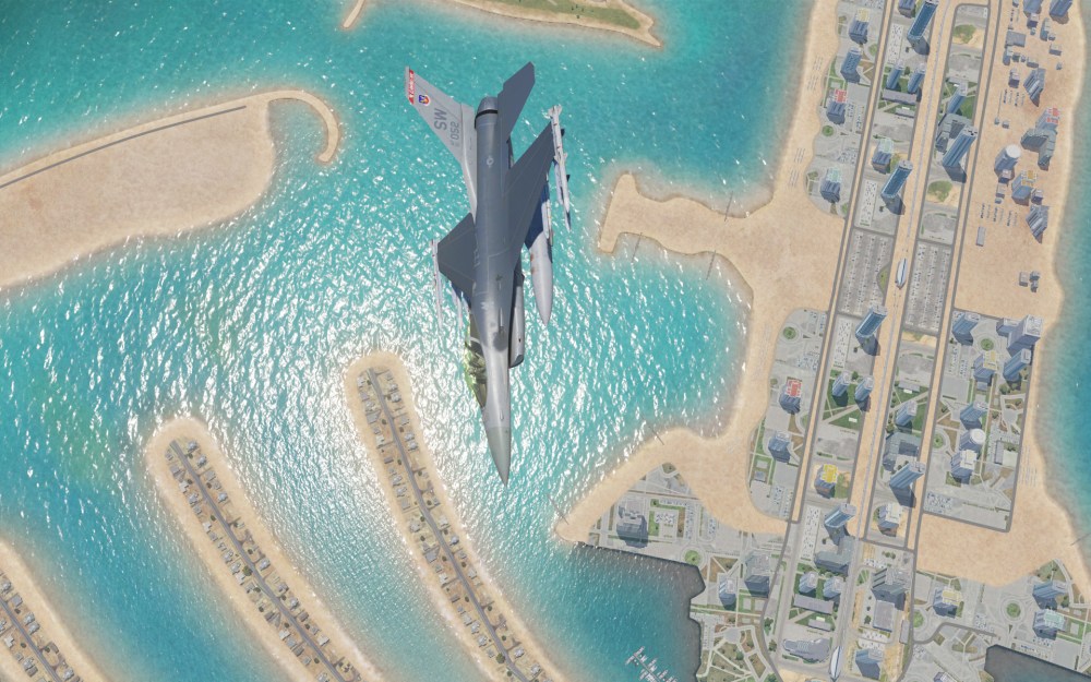 Then I turned it to nighttime. My first night flight over Dubai was flown with a full moon present and the moon now contributes significantly to the night time lighting. We also see lights from many kilometers away which makes the Dubai skyline come much more alive than we’ve ever seen it before. You can also spot the new afterburner effect on the DCS: F-16C which is much more elongated and apparently accurate to the real one. Superb!