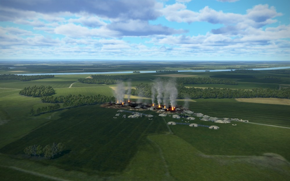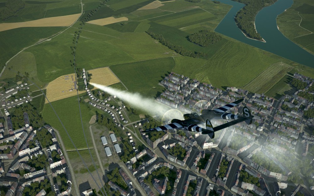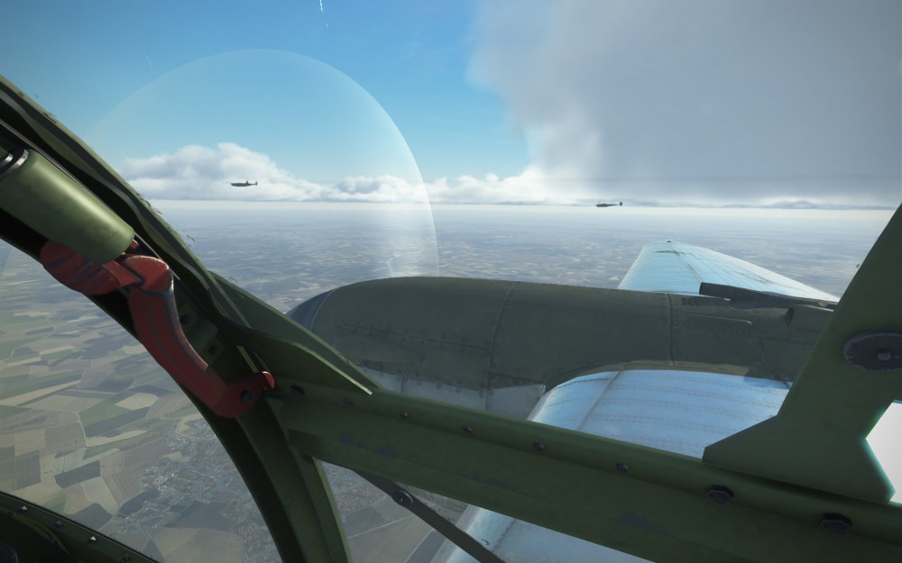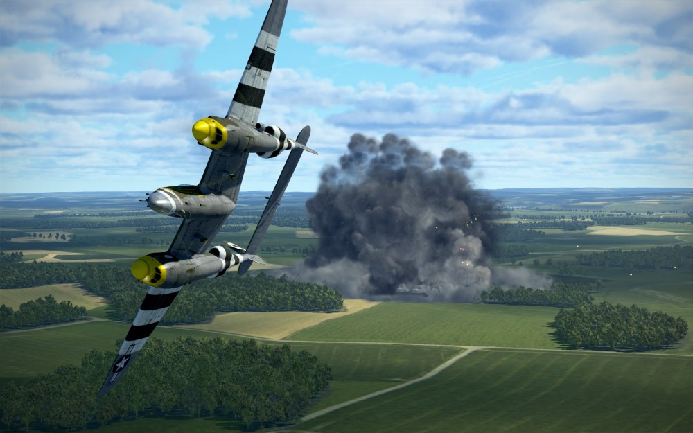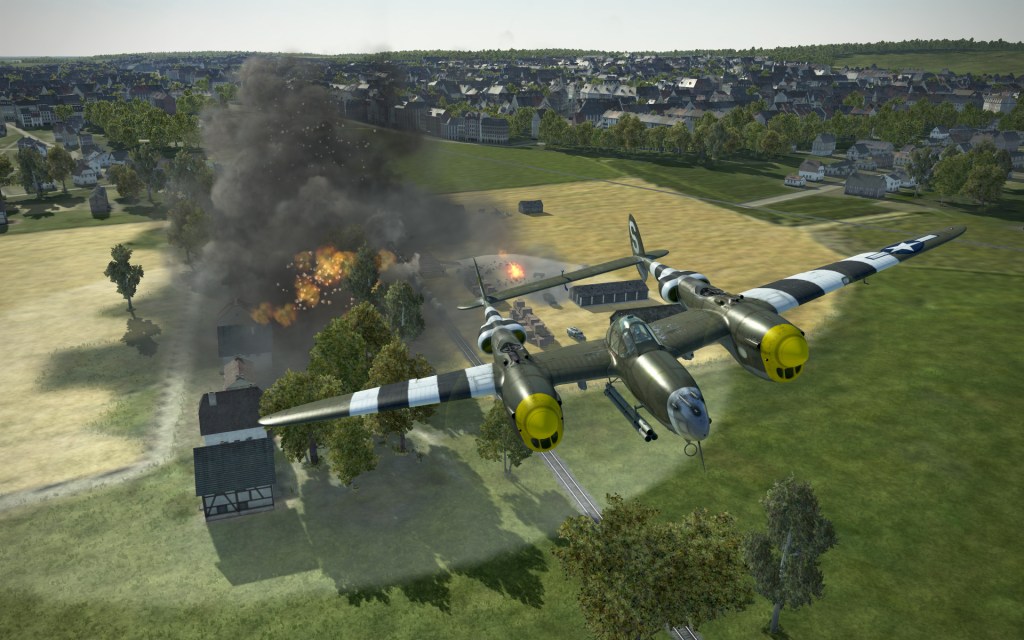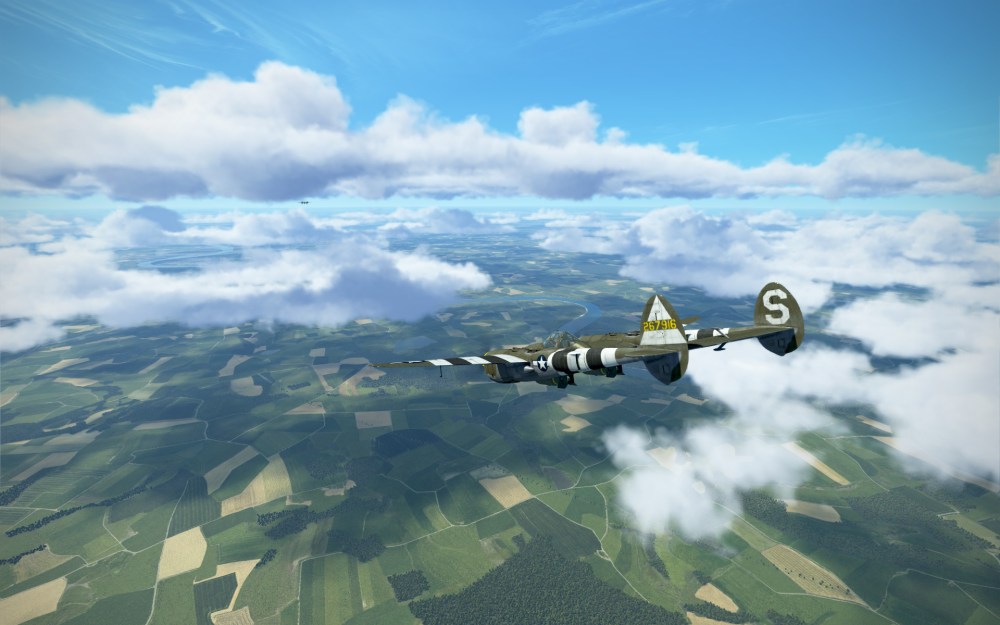 The flight was a cinematic one with multiple layers of clouds and crystal blue skies above. We came in around 20,000 feet before slowly descending through the cloud layer searching for our target. We knew we were in the right area, however, we were still dropping through clouds trying to find our target. Fortunately, at the last moment we broke through the bottom cloud layers and there it was. Four 2000lb bombs (that’s not a typo, the P-38 can carry huge bombs) obliterated most of the target area and we flew back to base at very high speeds hoping to avoid interception.