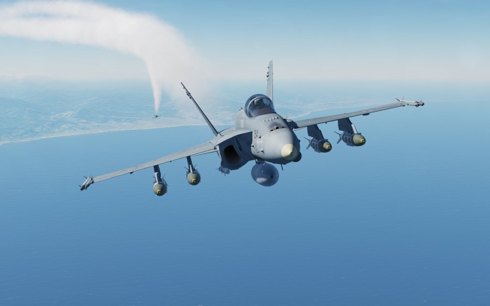 The JDAM, using Target of Opportunity (or TOO mode) together with the Litening pod is the easiest precision guided weapon I’ve used on the Hornet. Essentially you use the pod to find the target, hit the TDC depress, and if you have your JDAM configured it will load the coordinates from the pod into the bomb. All that’s left is to fly within range and wait for it to say ‘IN RNG’ on the HUD before releasing. Fire… and forget. You can quickly move on to another target and drop another bomb if you’re quick about it.