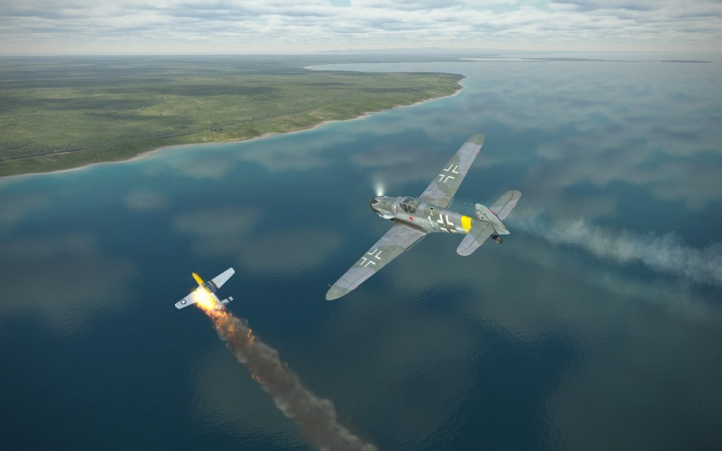 As we looped and spiraled I was able to get a lead on the Spitfire and unleashed a barrage of MK108 shells. It only took a brief moment and it became clear that the Spitfire was out of the fight. Crippled by the attack it spun slowly to the ground