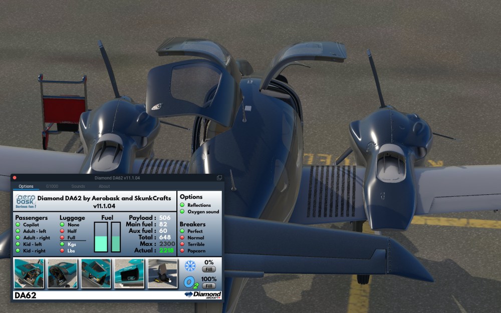 Aerobask’s DA62 starts to impress right away with a beautifully detailed cockpit (more on that later) and a simple control panel that lets you control some of the basic details of the aircraft. Doors and service hatches can be opened and closed, passengers determined, and overall fuel and weight settings adjusted.