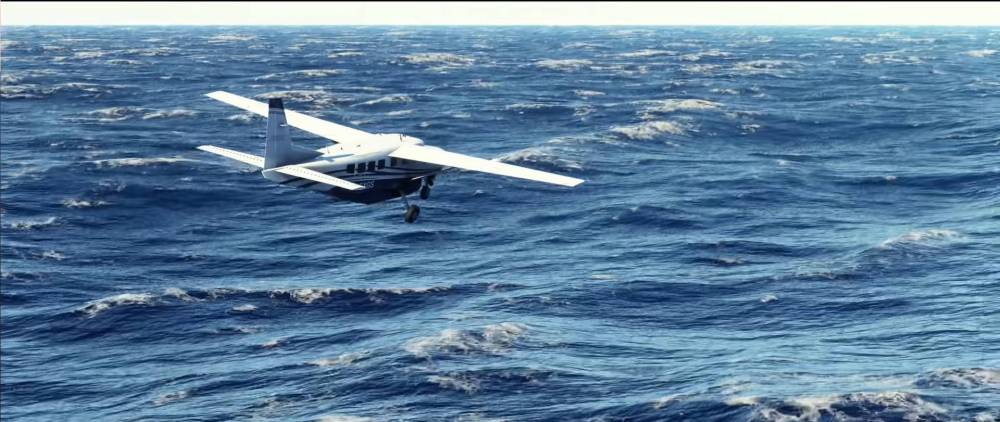 Next up, we see a Cessna 208B Caravan flying a low approach over some choppy water. The waves look spectacular as ever.