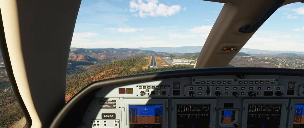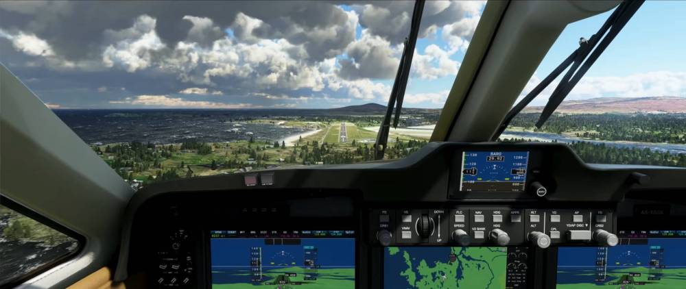 A similar view of the same airport although it looks like the weather conditions are subtly different with clearer skies off to the right side. There aren’t a huge number of cockpit shots in this trailer but this one shows off the glass panels to good effect.
