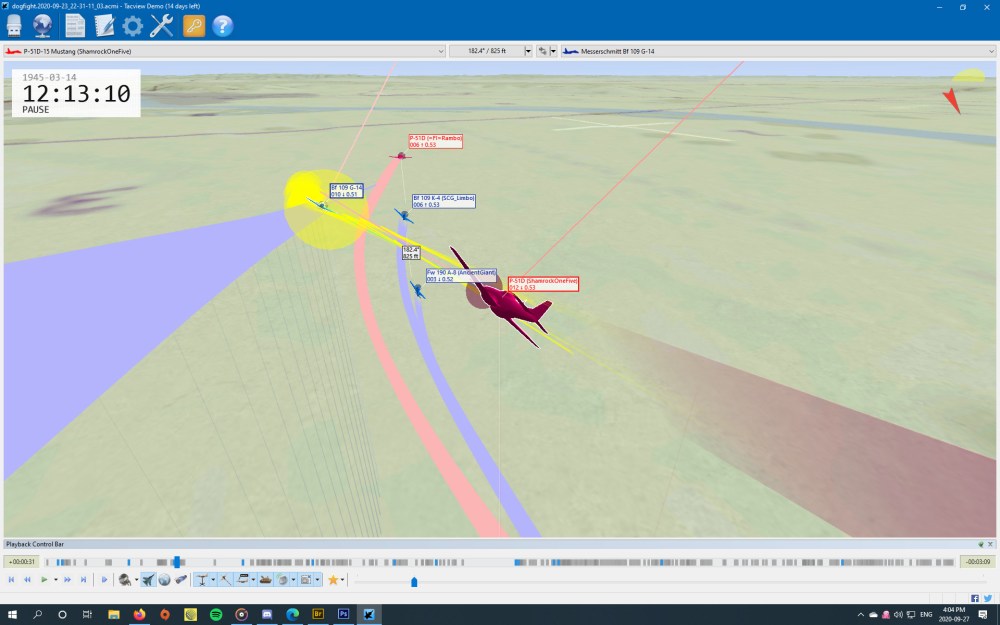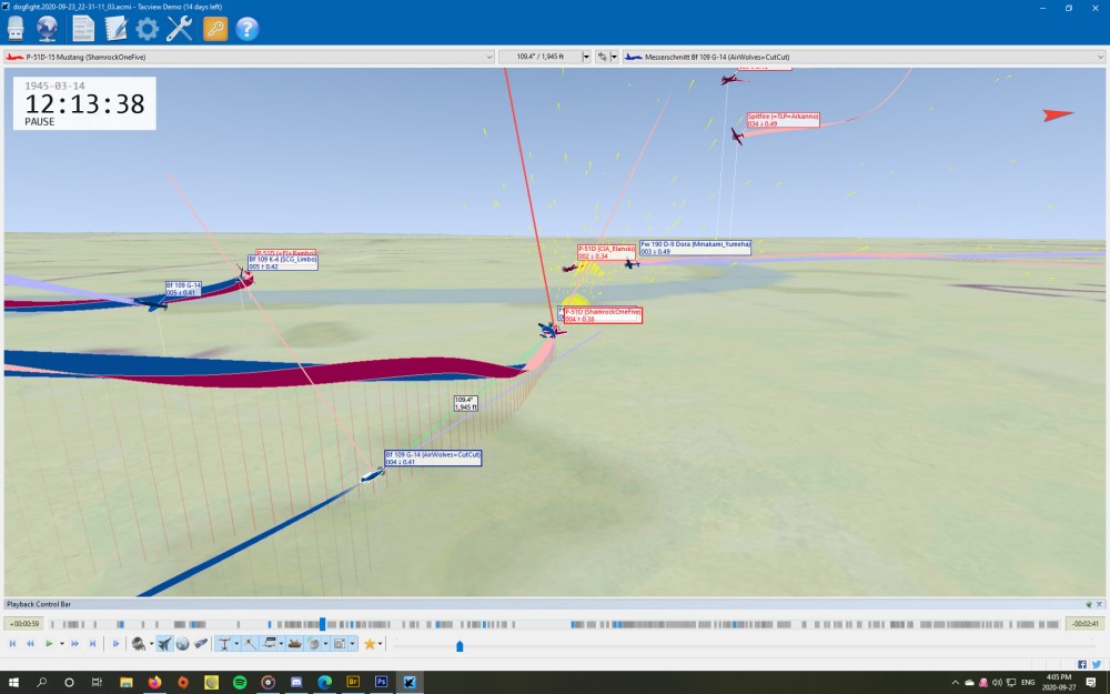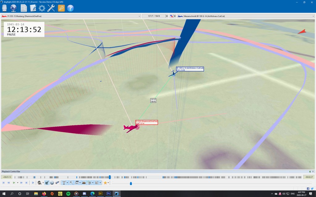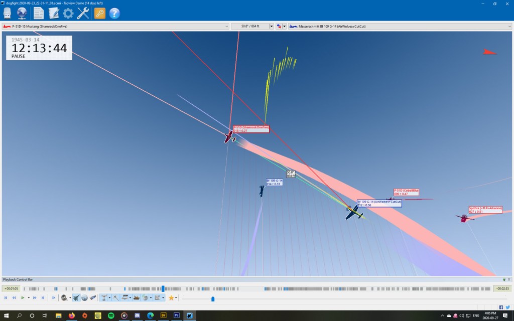 I’m adding TacView to some of my Flight Journal pieces both to help visualize the fights and for my own personal learning. I’ve got the free trial running right now but I will be buying a copy very soon. In these next images you can see as I tumbled and then regained control behind the Bf109.