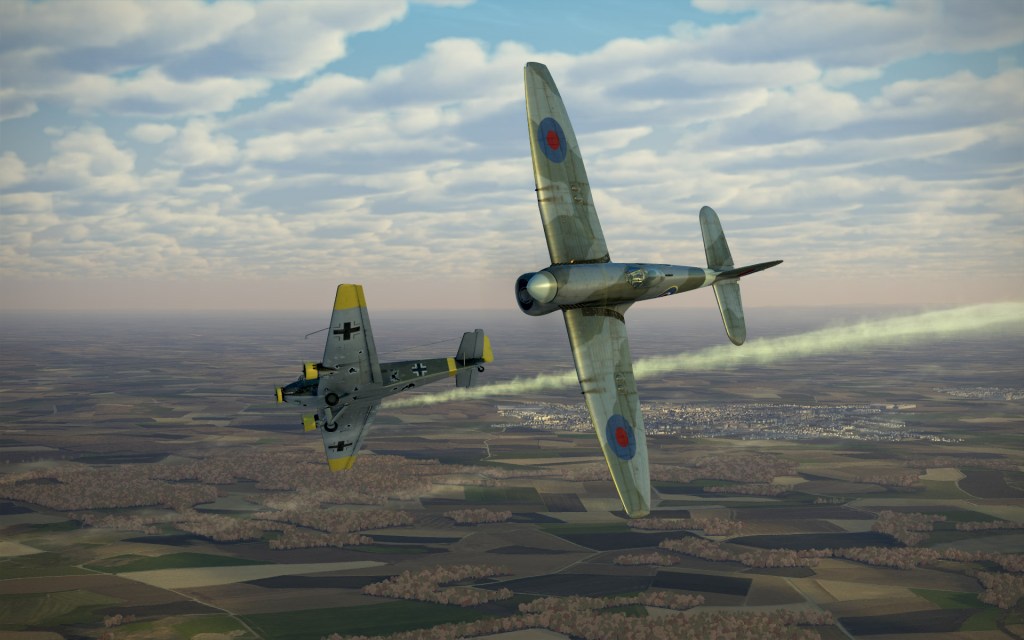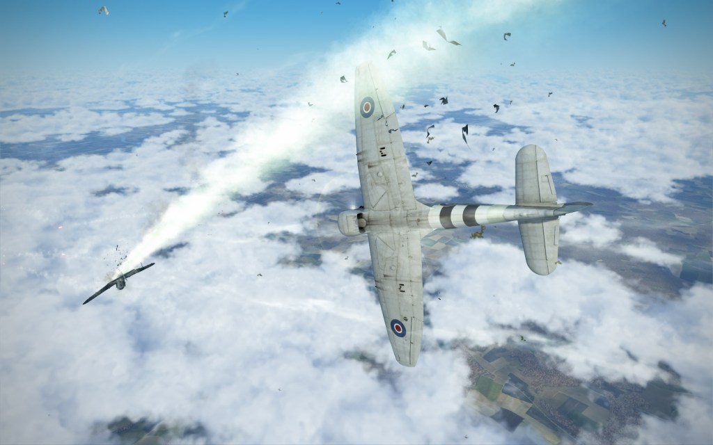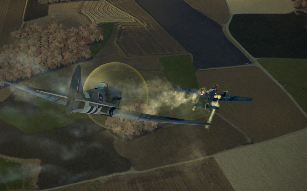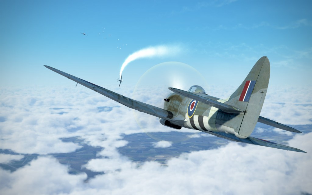 A flight or more of Bf109’s were closing on the last bomber group’s six but fortunately other Allied fighters had already spotted and engaged and we joined the fray. The first Bf109 I got behind benefited from my recent lack of time on the Tempest as the first shots went wild… except two… which caused a fuel leak and clearly destroyed a control cable as the Bf109 spun quickly out of control.