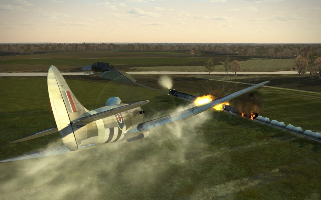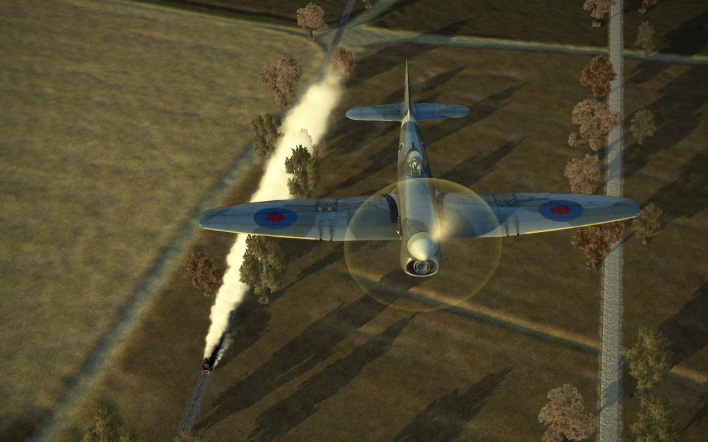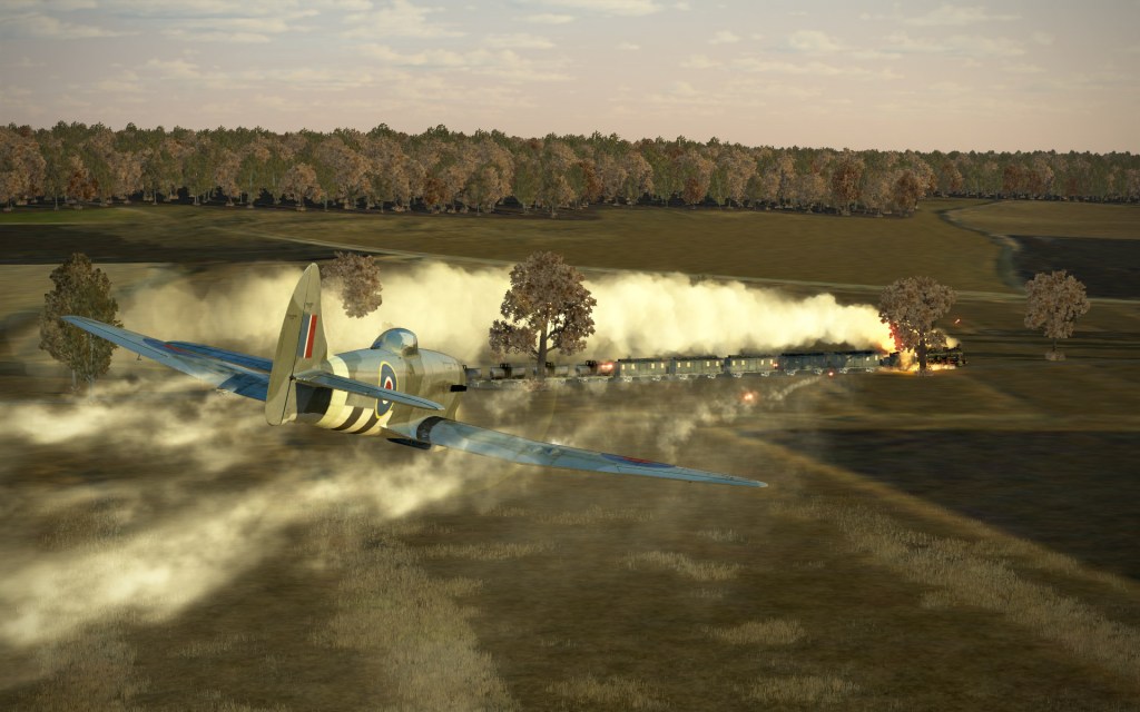 We pounced on both trains as all eight Tempest’s, once ensuring the nearby airspace was clear of German aircraft, engaged the targets. In my first pass on the first train I went for the locomotive and tender causing crippling damage and causing the train to come to a stop.