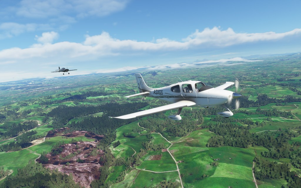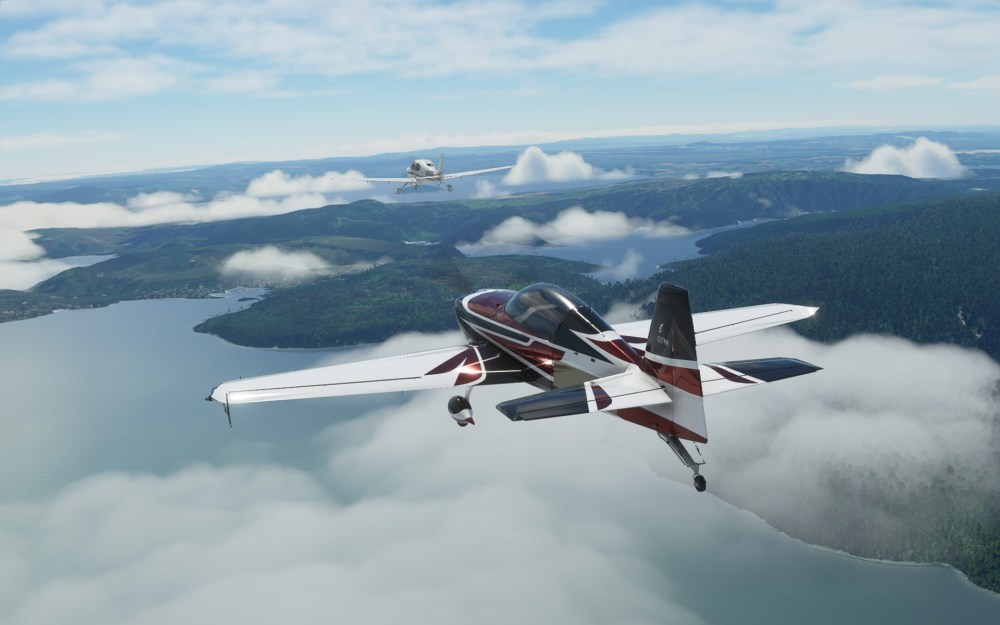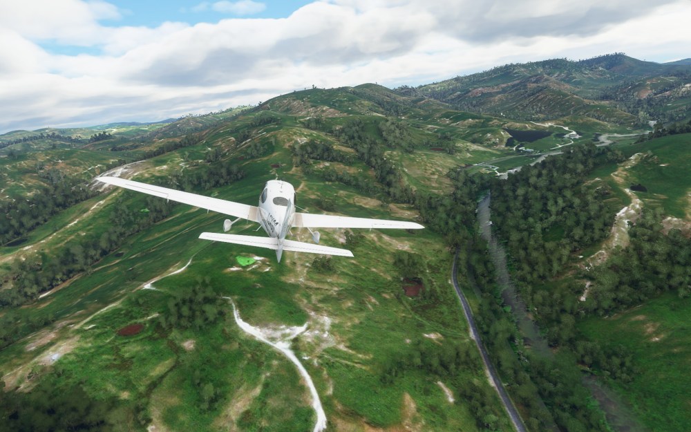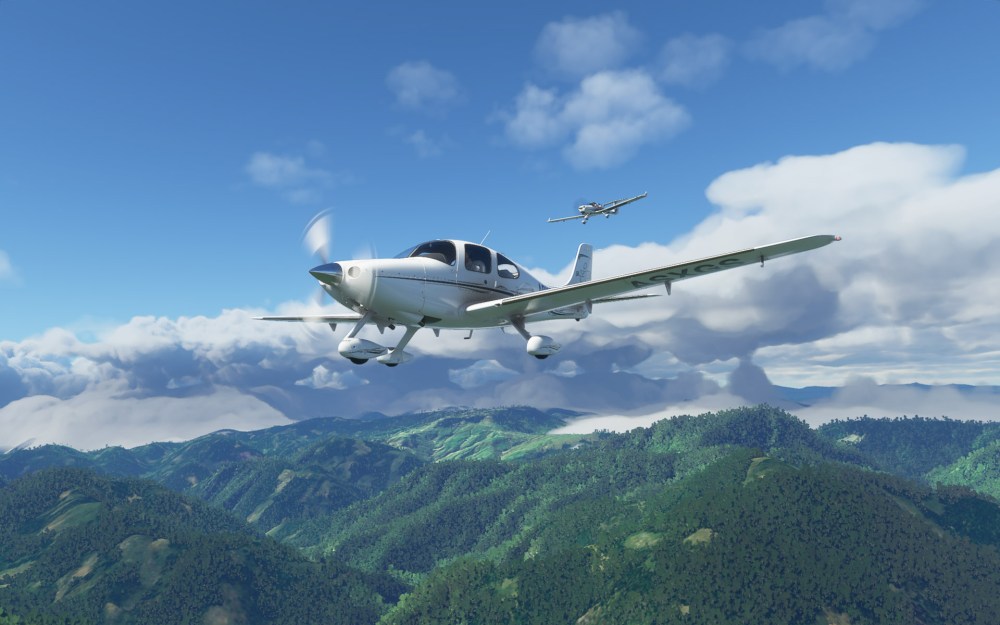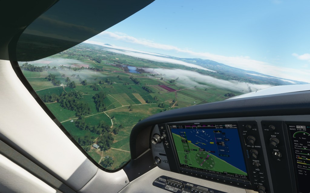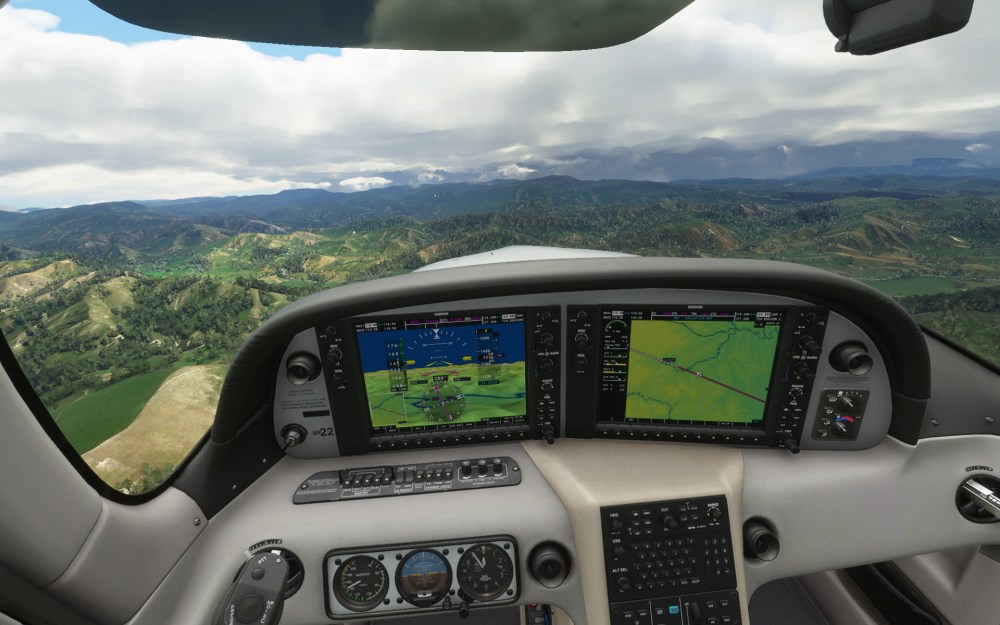 Continuing on, we needed to keep on climbing through the middle part of our journey as the land rose up. Careful management of speed and altitude in these GA aircraft was required but we managed to get above even the tallest terrain without too much difficulty. My fellow flier decided he wanted to switch to another aircraft and do some closer formation flying and this is something Flight Simulator is great at. He was able to spot my aircraft icon and spawn near me with a new plane without trouble.