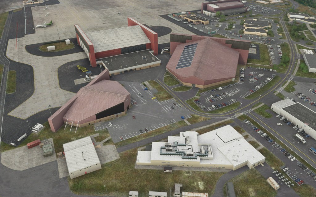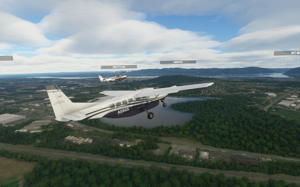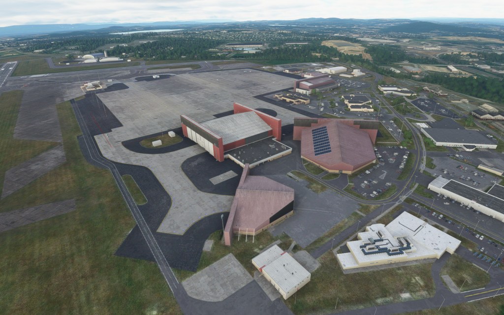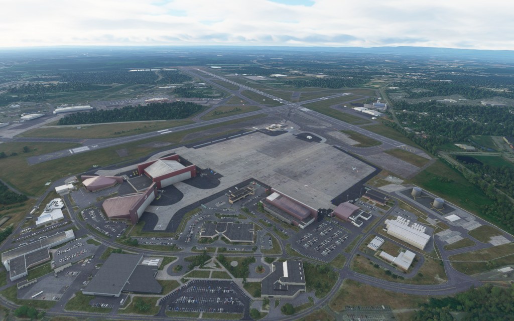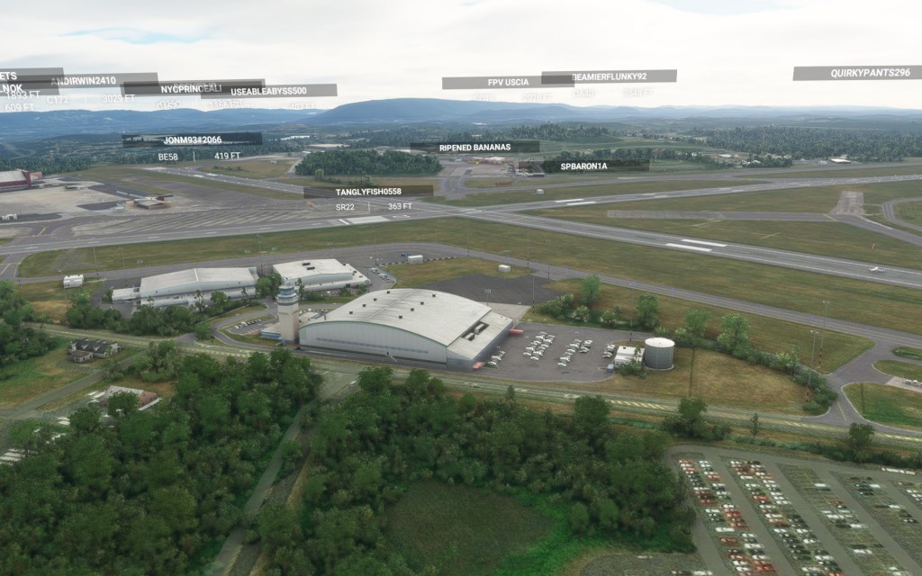 Before takeoff, I had a look around using the drone camera to appreciate the added detail at Stewart International. Interestingly, I had previously landed at this airport after flying around the area shortly after release. The upgrade to the airport added notable details. The parking lots, the solar panels on one of the hangar roofs, the unique hangars from the airports past as a USAF base and current use as a Air National Guard base hosting C-17 Globemaster III’s and Marine Corps Reserve KC-130T’s. There’s also plenty of civilian activity here and on one of the first nights of the new world update, plenty of virtual pilot activity too!