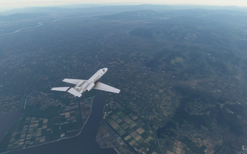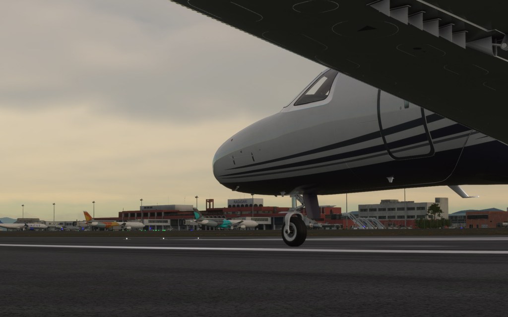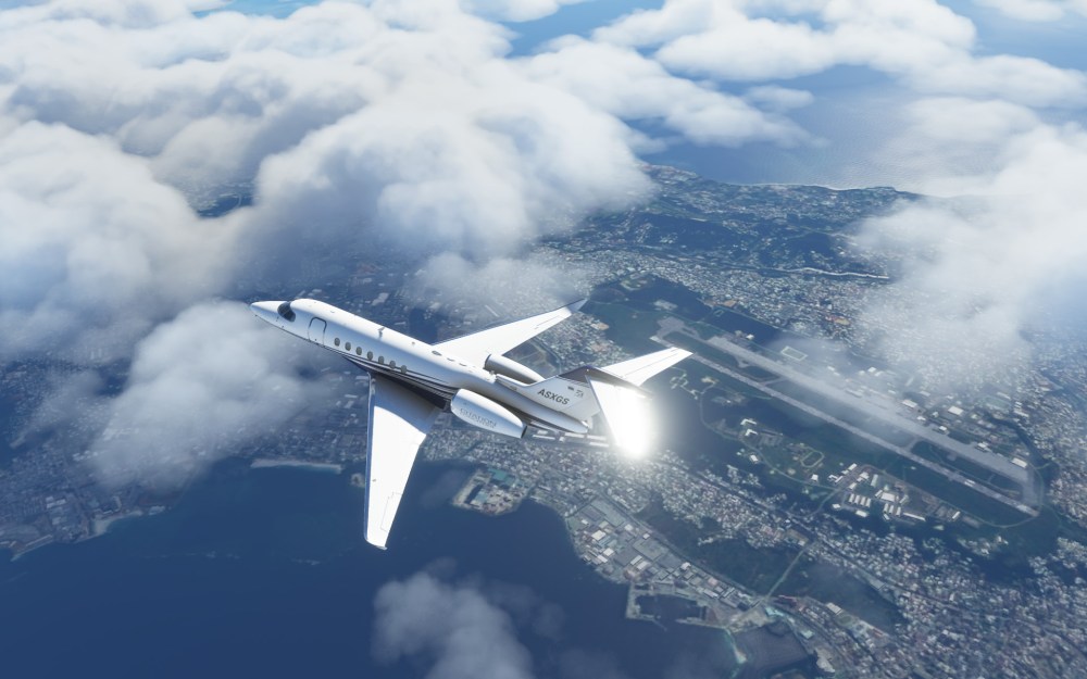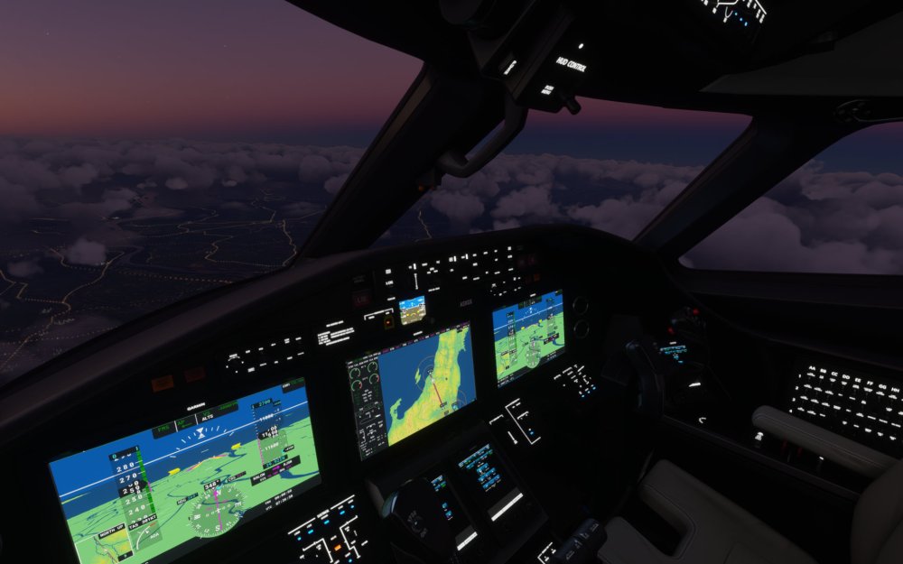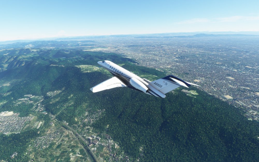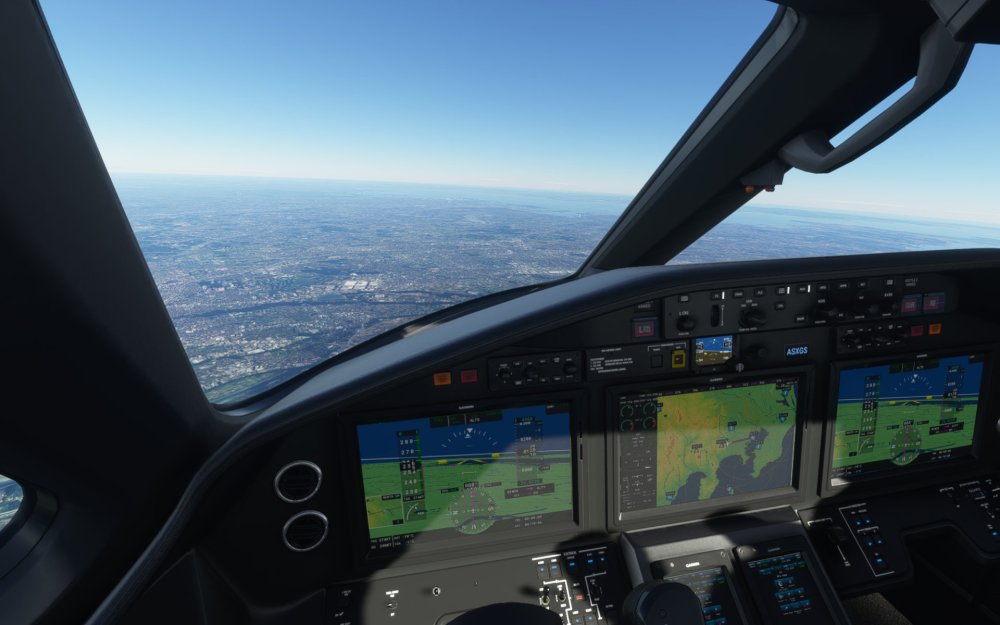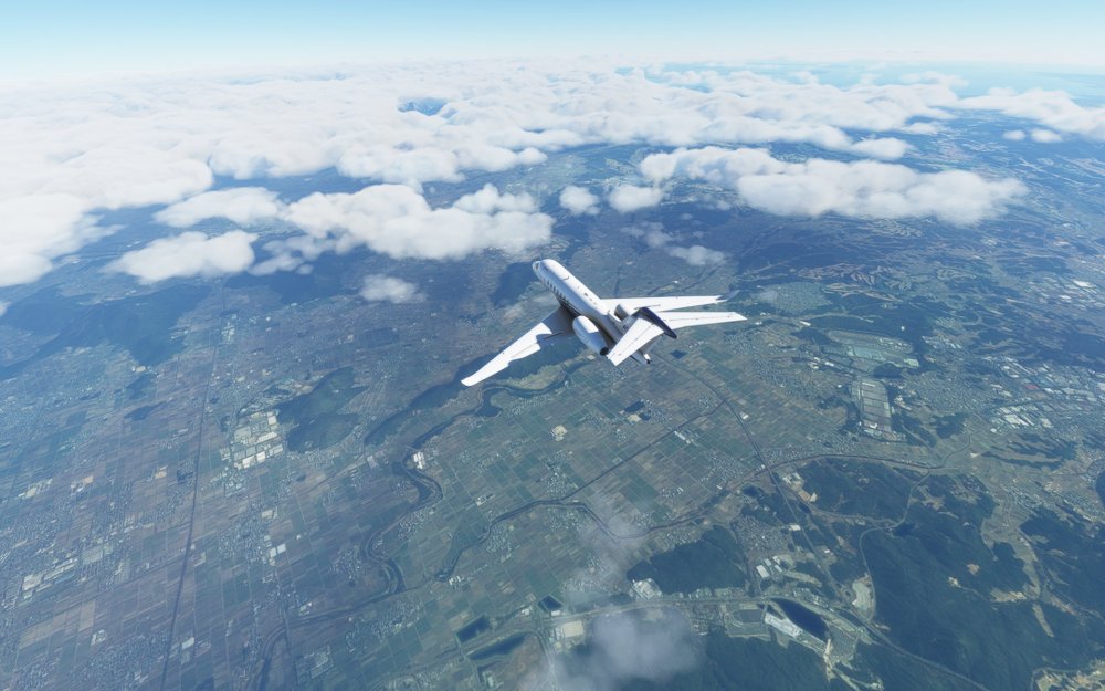 Unlike my past troubles with autopilot, a few more updates had come through and the team at Asobo Studios seemed to have fixed at least some of the problems. My flight was uninterrupted by any errant autopilots trying to crash the plane. The weather on the other hand, was gloomy as we departed Nagasaki and climbed to 30,000 feet over a thin cloud layer at 28,000 feet. The winds were strong and the turbulence intense. Winds caused me to have quite a bit of trouble with the CJ4 on landing at Osaka but I was still able to get some good screenshots in.