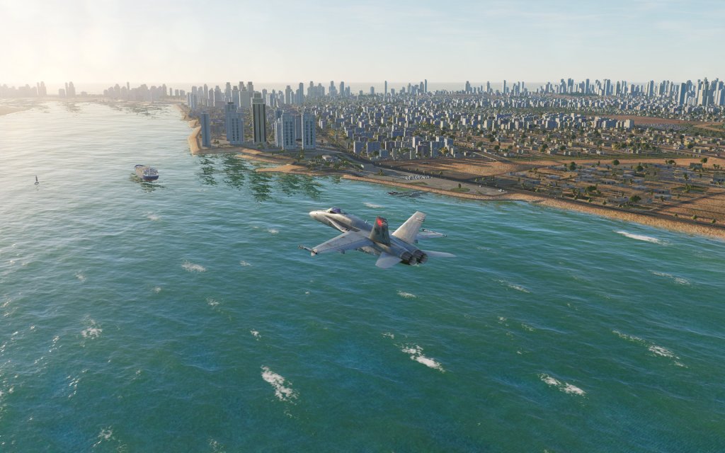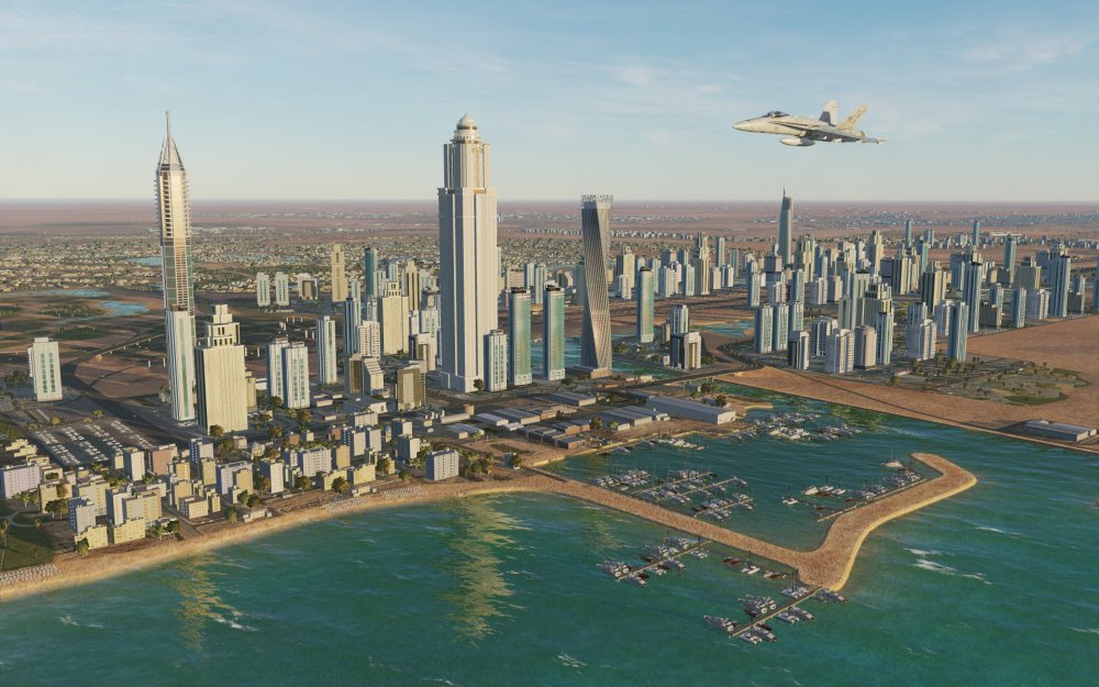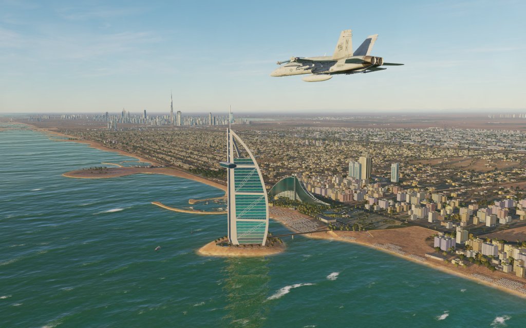 Featuring 200,000 sq km of terrain centered on the strategically important Straight of Hormuz, the area has been the site of modern tensions and makes a terrific hypothetical battle space for a combat flight simulator. The map has significant range of terrain types from the extremely mountainous northern region of the map to the flat desert sands in the south. The Iranian port city of Bandar Abbas as well as the highly mountainous cities of Shiraz and Kerman offer unique areas on the map that are rivaled by the high-tech and modern skyscrapers of Dubai and Abu Dhabi. Both the Gulf of Oman and Persian Gulf are part of the map and offer enough room for carrier battle groups to maneuver in.