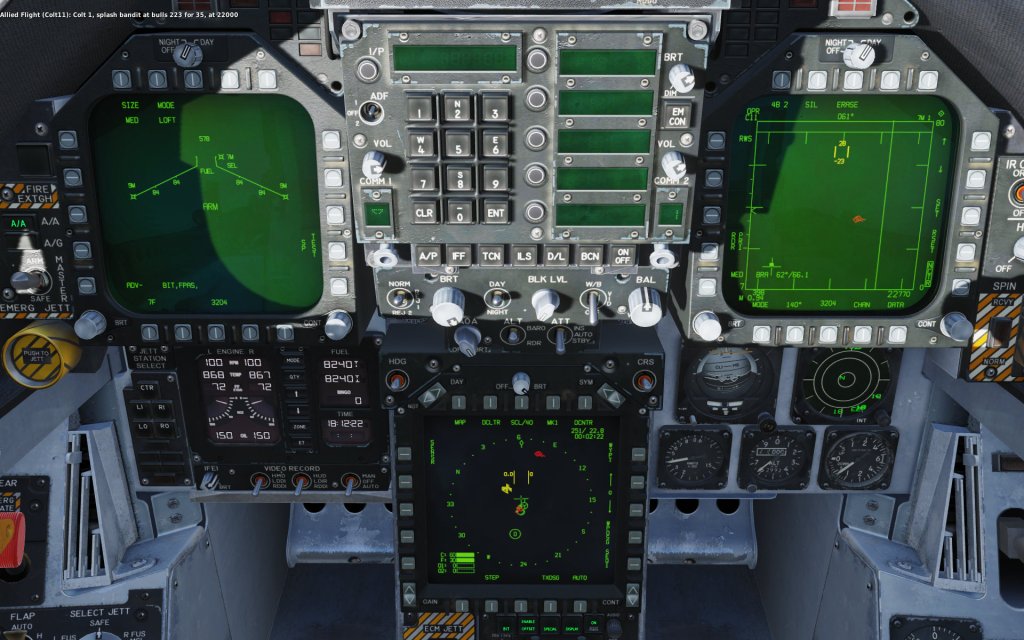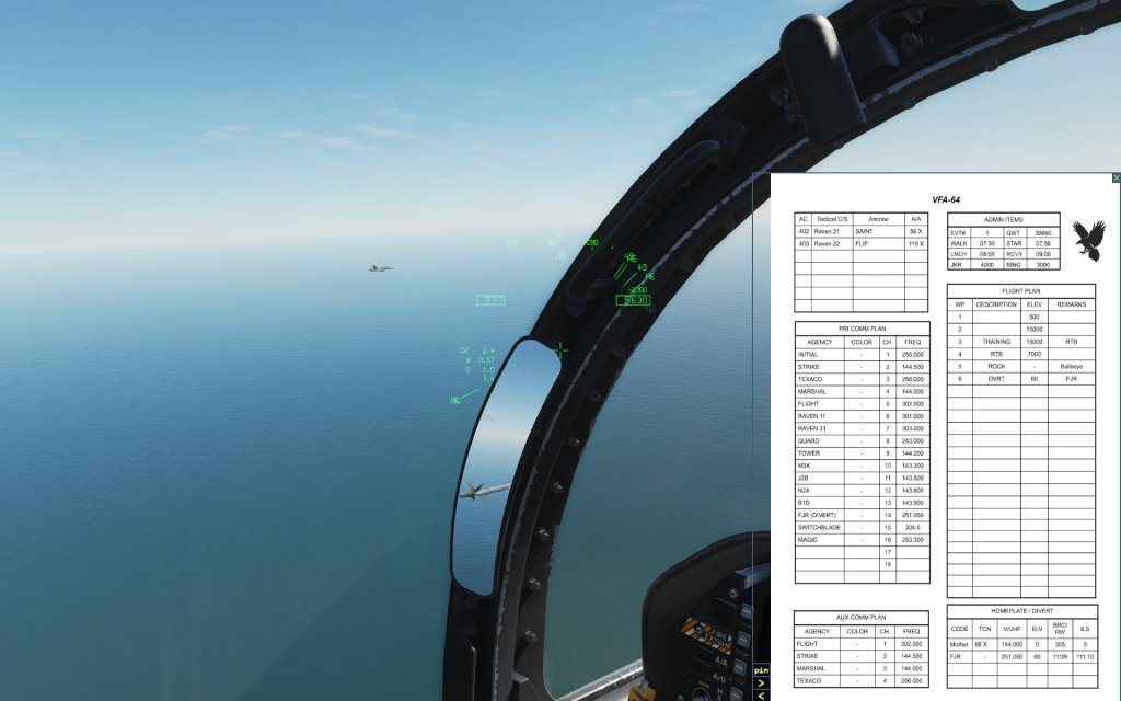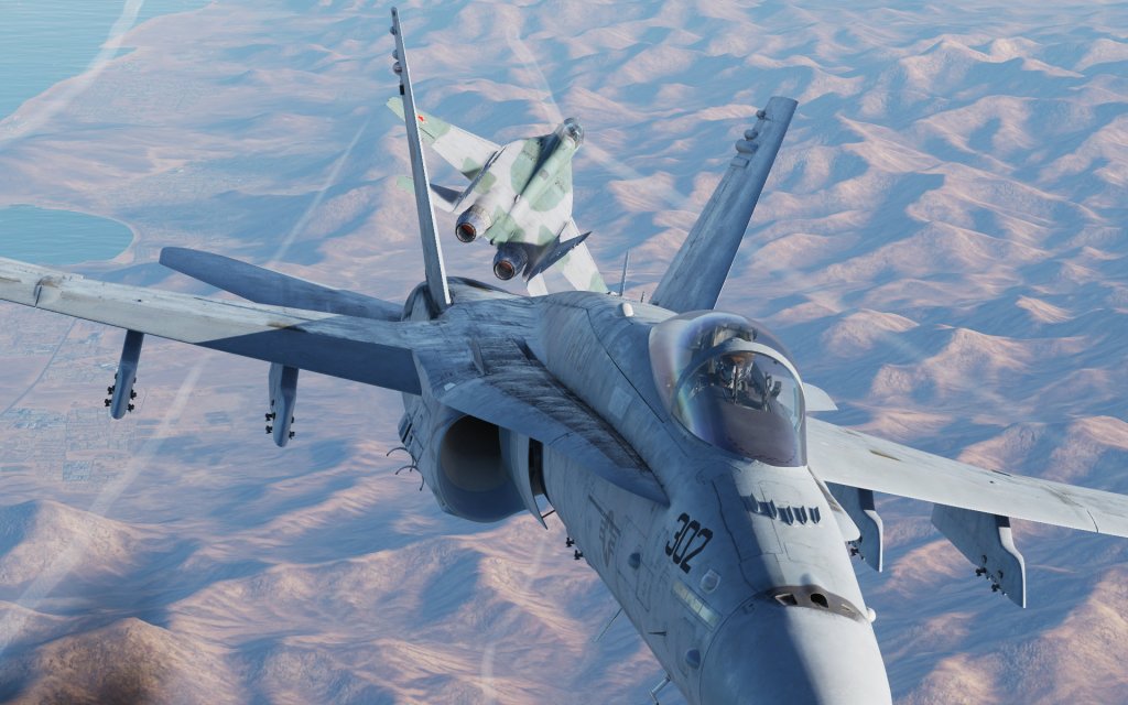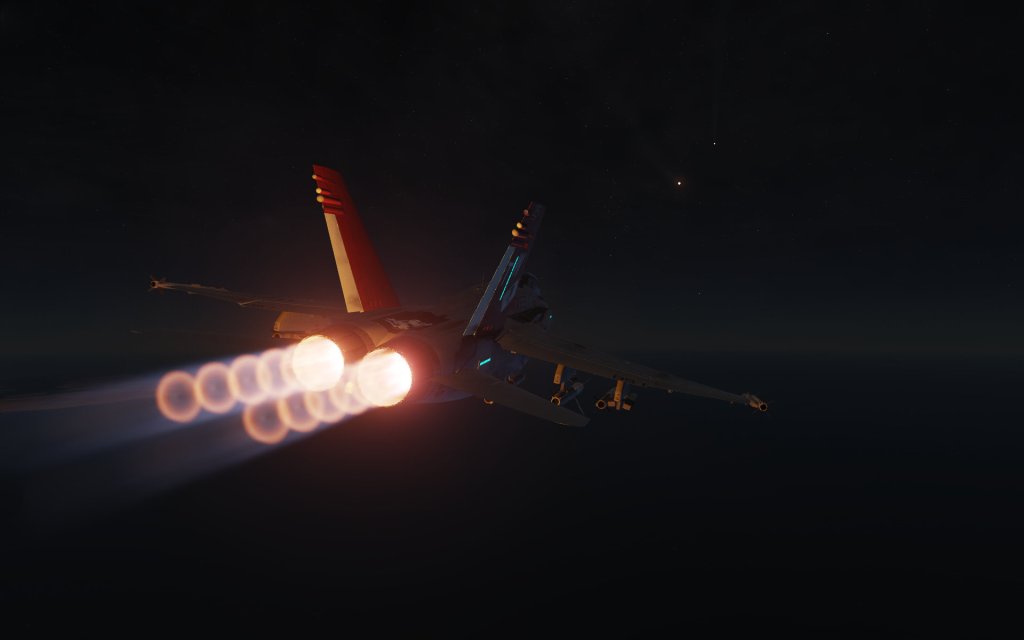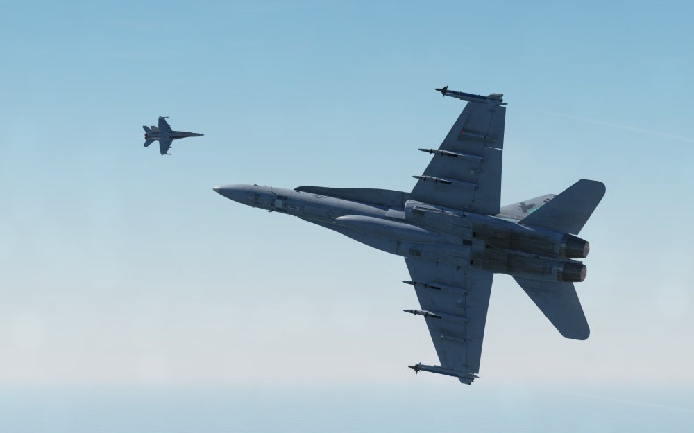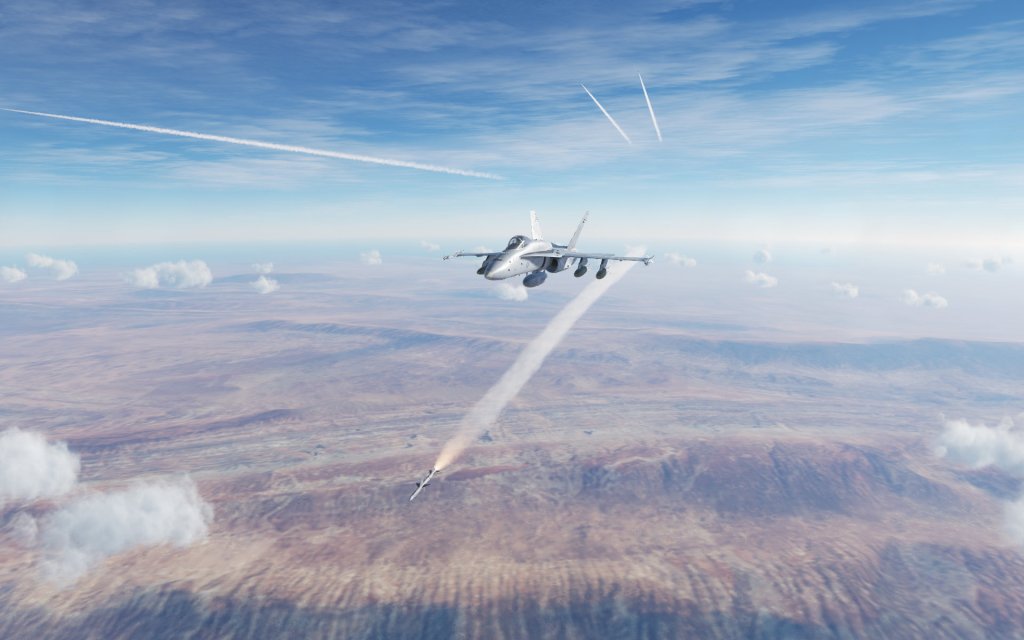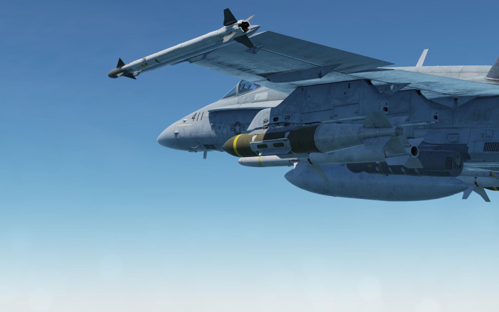 The Hornet is a fully capable fighter jet with beyond visual range air-to-air engagement capabilities including the ability to simultaneously engage multiple targets at once. Once the range has closed up, the Hornet has a wide variety of tricks available to it including the thrust vectoring AIM-9X Sidewinder missile, the JHMCS helmet display that allows the Hornet to point and lock targets using the pilots head, and an unprecedented ability to convert speed to angle and point the nose at a target in a high stakes fight. The Hornet also has Link 16 datalink functionality that gives you a top down view of the battlefield with data being fed in by other jets.