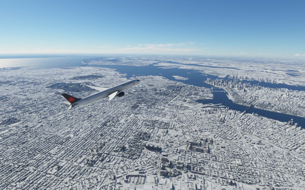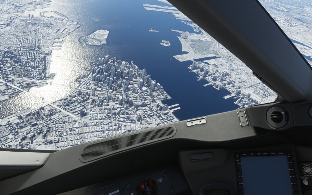 I was going to pick an American carrier for this flight but when I loaded into Microsoft Flight Simulator I realized that I had only installed the Air Canada 787 so that’s what I picked for this flight. Taking off from a snowy John F. Kennedy airport, my departure route took me over New York City with famous areas such as Brooklyn and Manhattan on full display.