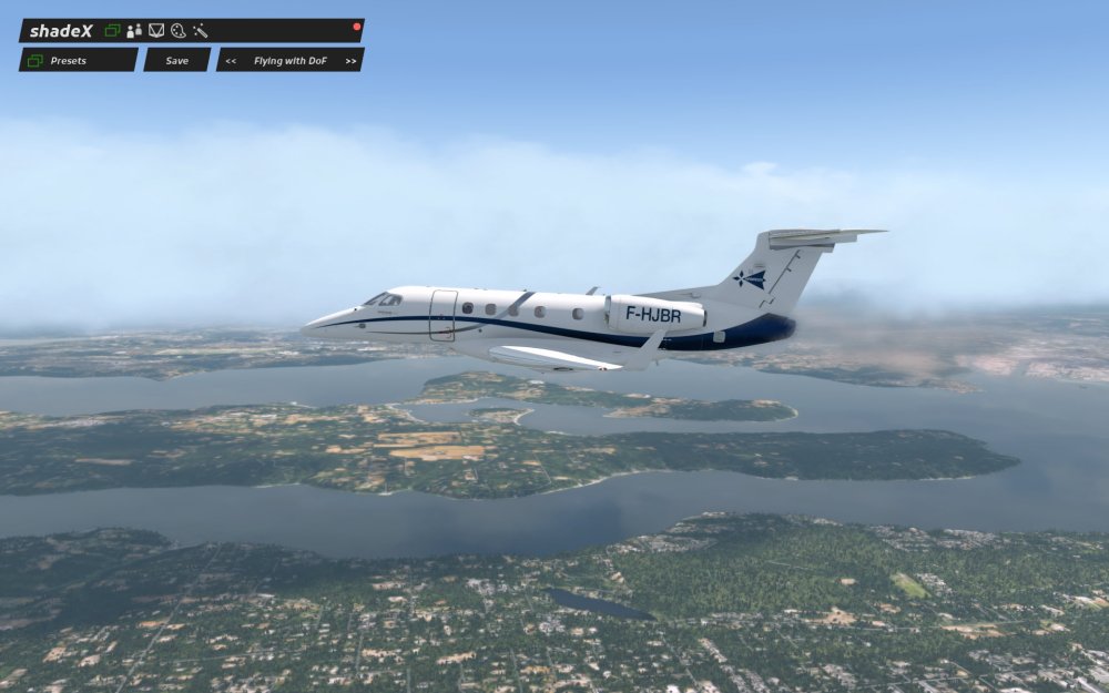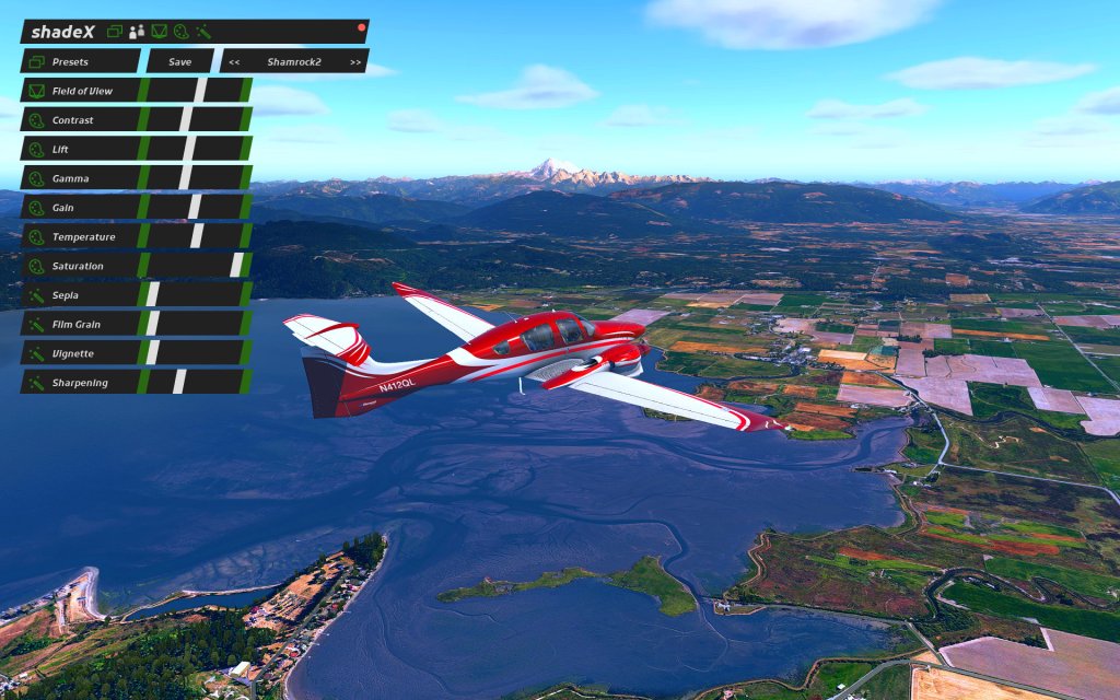 shadeX essentially takes standard X-Plane 11 and puts some shaders on top of it that can do things like increase contrast, change the gamma, change the colour temperature (making things more orange or blue), add in depth of field settings to make your aircraft in focus and the background blurry, or even do things like apply a film grain, a vignette, or sharpen the scene.