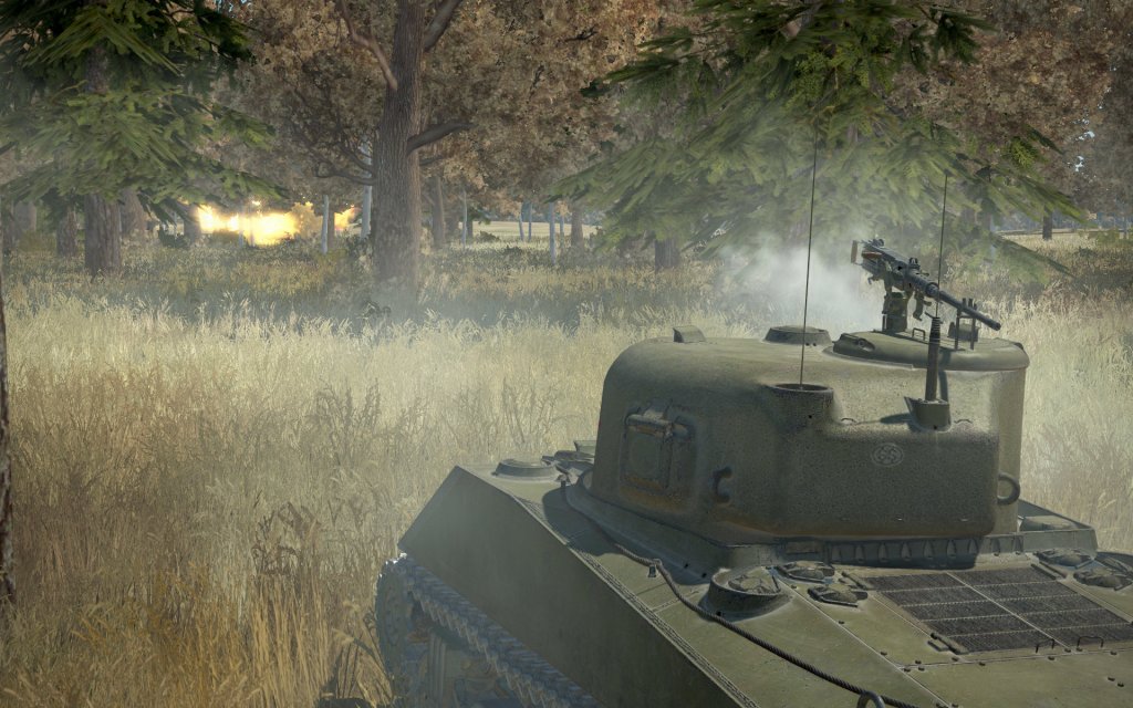Cannon and machine gun fire arced through the trees with shells ricocheting off different objects as another tank engaged us. This Panzer was obscured by a tree from my vantage point but I fired blindly. In reviewing the track later I saw that my shots were close… but none landed. Fortunately, another in our group engaged and hit the enemy tank a few times before it too was on fire and out of action.