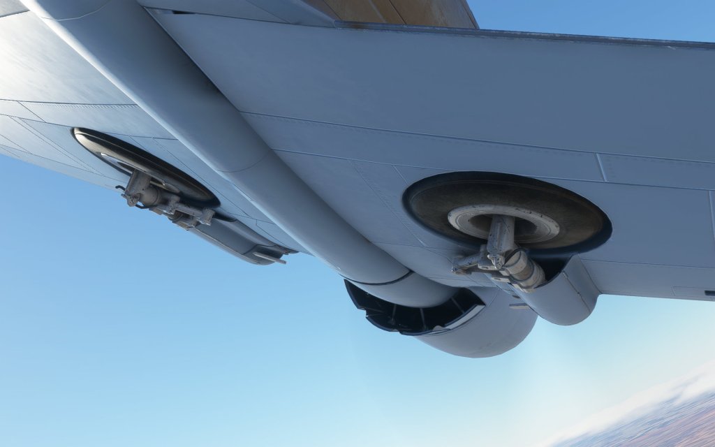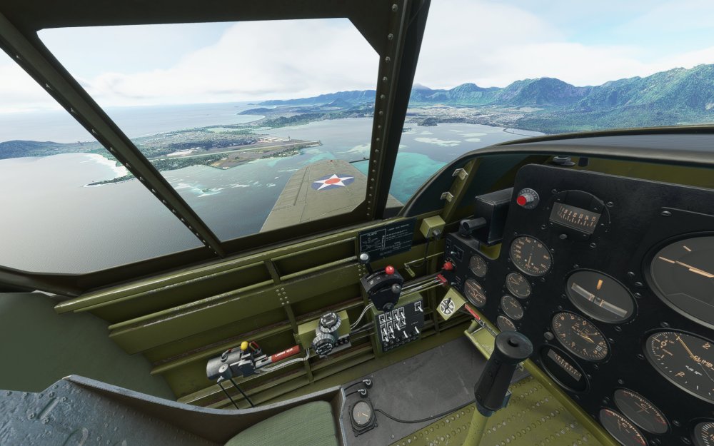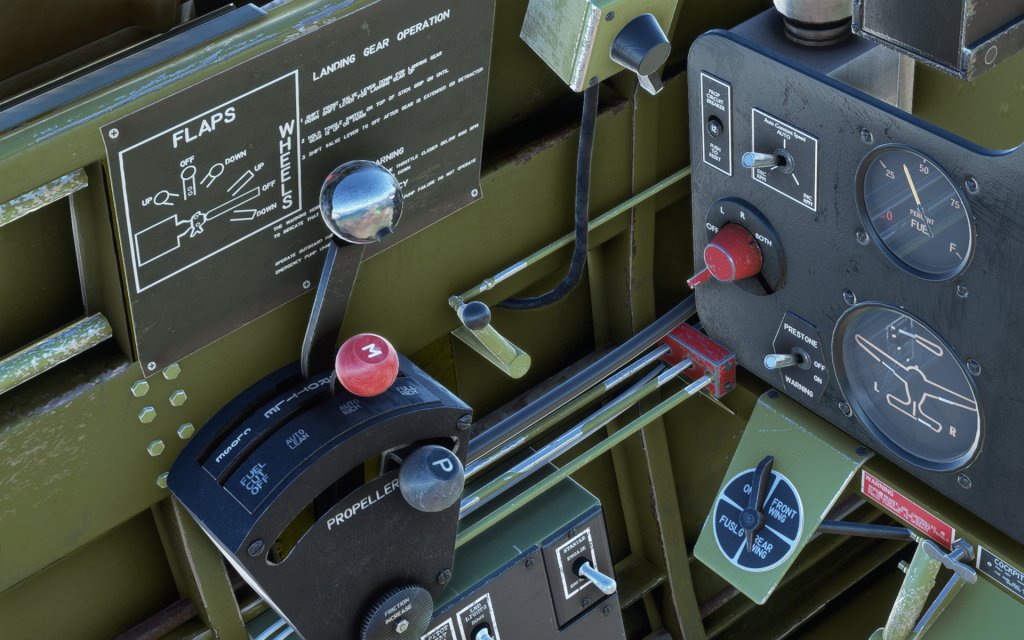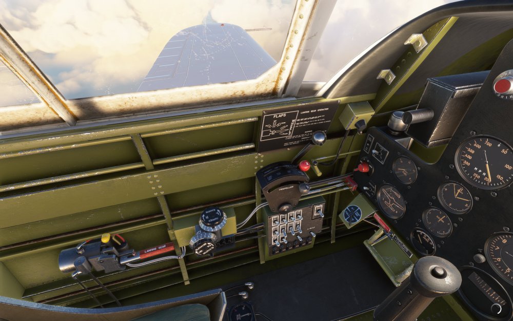 Inside the cockpit, the attention to detail continues. Here there’s plenty of texture work to show off some of the chipped paint and well-worn areas. All of the switches, trim dials, wheels, and other buttons that I’ve pressed all work and are well animated. The cockpit lighting looks great too!