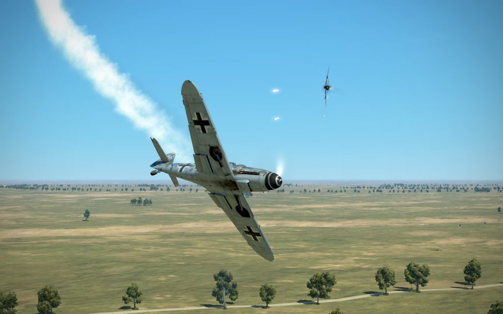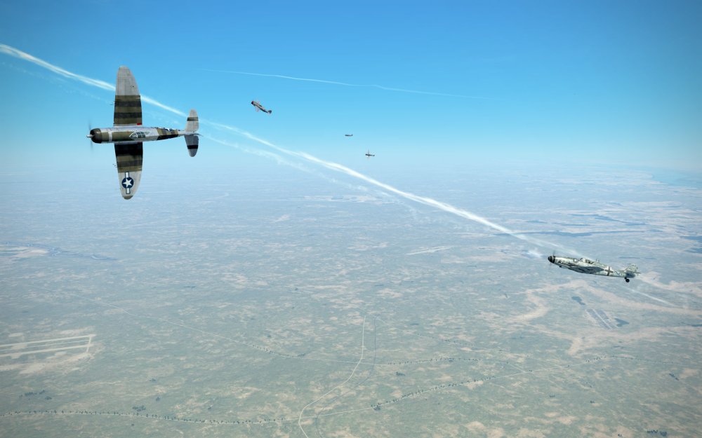The 109 turned, away from one of us only to have another Thunderbolt drop in. The fight went low and as the 109 evaded one of our attacks, I turned hard and positioned for a deflection shot into the 109. A spray of .50cal bullets damaged the 109 but I did not press the attack and instead converted my speed back into altitude.