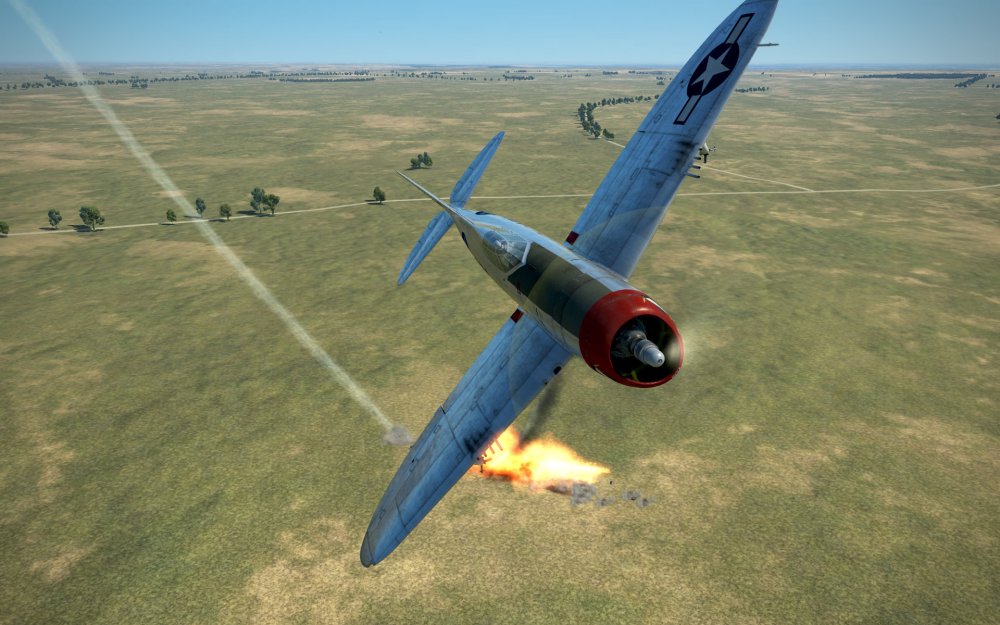 A third fighter appeared and dove from a higher altitude to engage us. I evaded him at first but a lucky MK108 spray got me and destroyed my aircraft. Tough as the Thunderbolt is, a couple of 30mm hits is absolutely destructive.