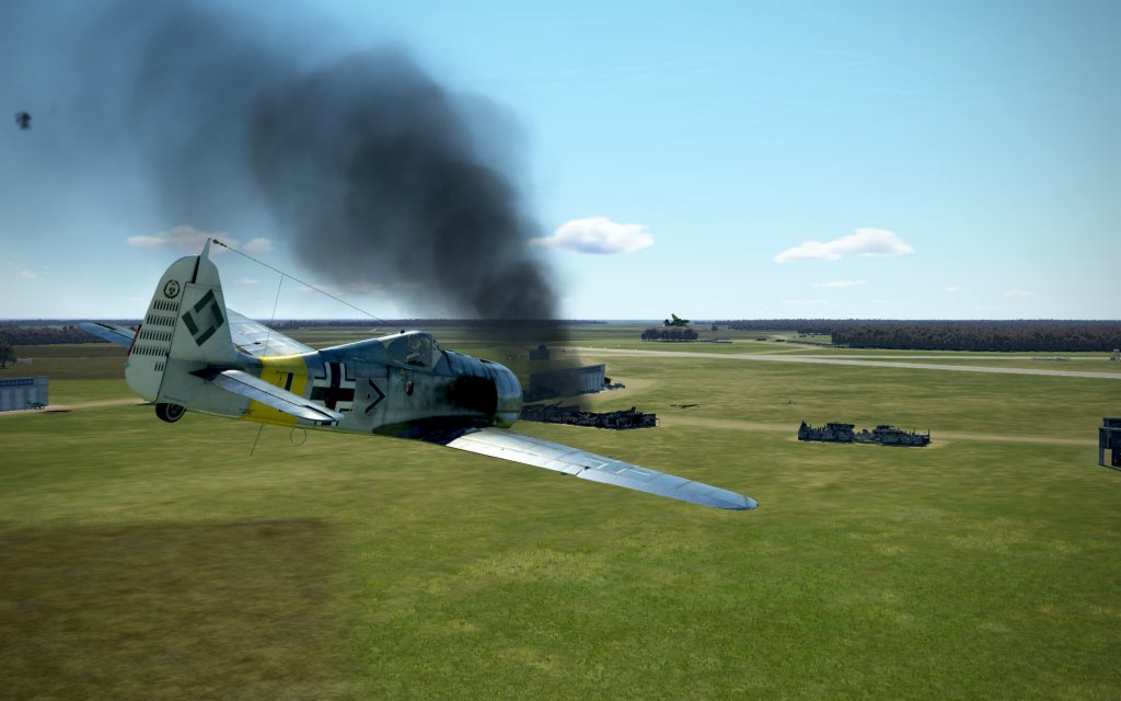 An A-20B let loose a string of bombs on the target while we dove in for the attack. Peregryn made the first pass damaging the A-20. But it remained flying and so I lined up and fired a second burst. Unluckily, both elevators came flying off the aircraft and hit my propeller. I glided in to a landing at the base.