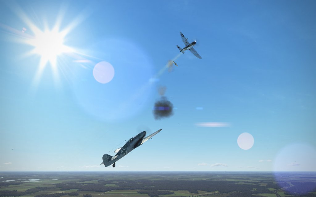 A P-51 locked onto my six and I began rapid rolls to left and right with tight turns attempting to force the Mustang to overshoot. Peregryn engaged the Mustang damaging him before breaking off with a Mustang on him as well. I continued the defensive as the lead Mustang pressed home the attack. Then a Bf110, already alerted to the action, hit the Mustang with a well aimed burst. I was saved.