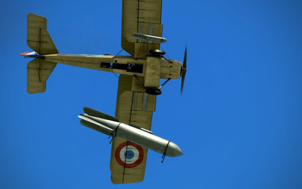 The Bréguet 14.B2 is primarily a bomber and it certainly has the weapons load to prove it. It can be loaded with 32 8kg bombs, 16 20kg bombs or 8 40kg bombs in capacities up to 320 kg of total weapons storage. By WWI standards, this is an impressive bomb load! For the moment this is the most potent bomber loadout available in any Flying Circus aircraft (soon to be displaced by the Handley Page and Gotha bombers).