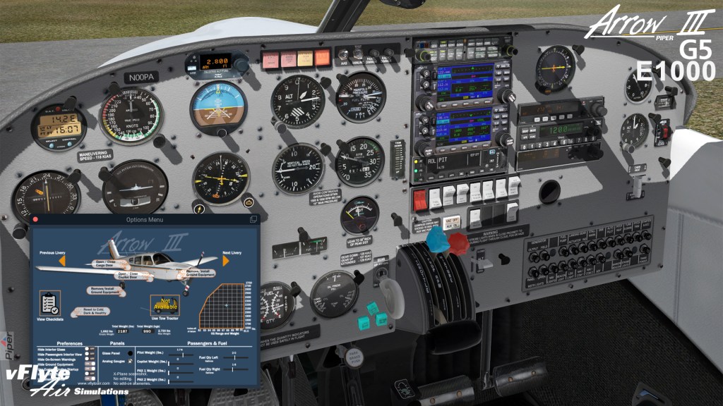 vFlyteAir is keen to point out that this new aircraft release is not a small upgrade to prior Arrow releases but is instead a brand new aircraft project that they have been working on for a couple of years. The ‘Piper PA28R Arrow III G5 – E1000’ is unique in that it has two available avionics systems including a custom coded Garmin G5 (and GFC500 Autopilot) and an Aspen EFDE1000.