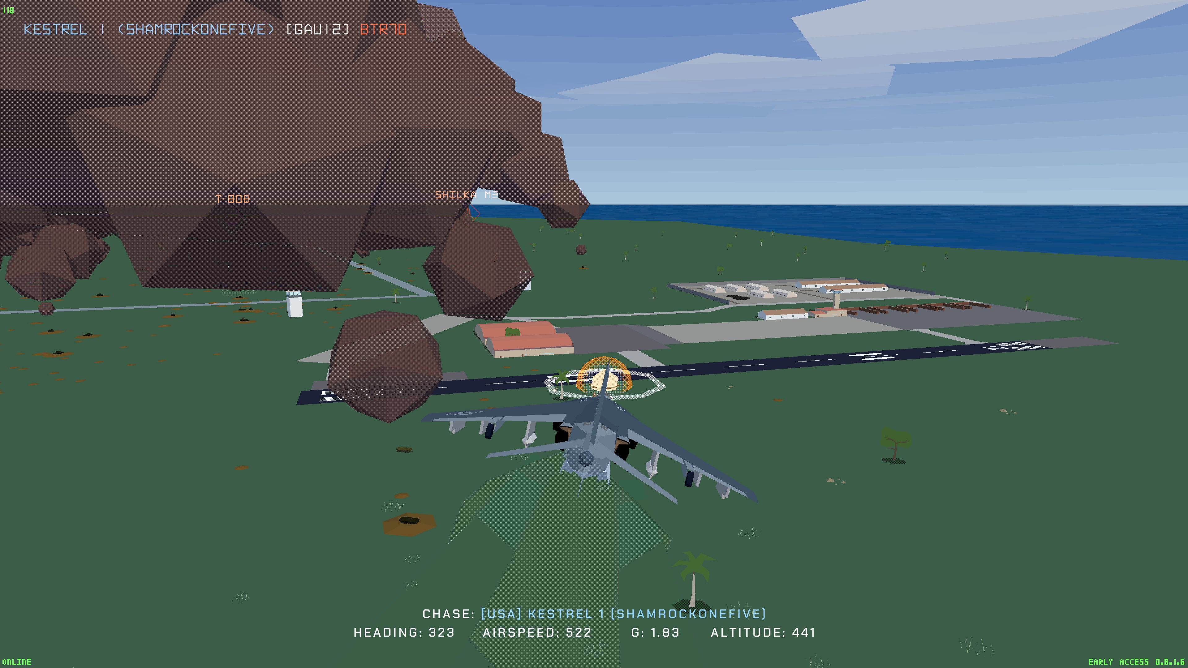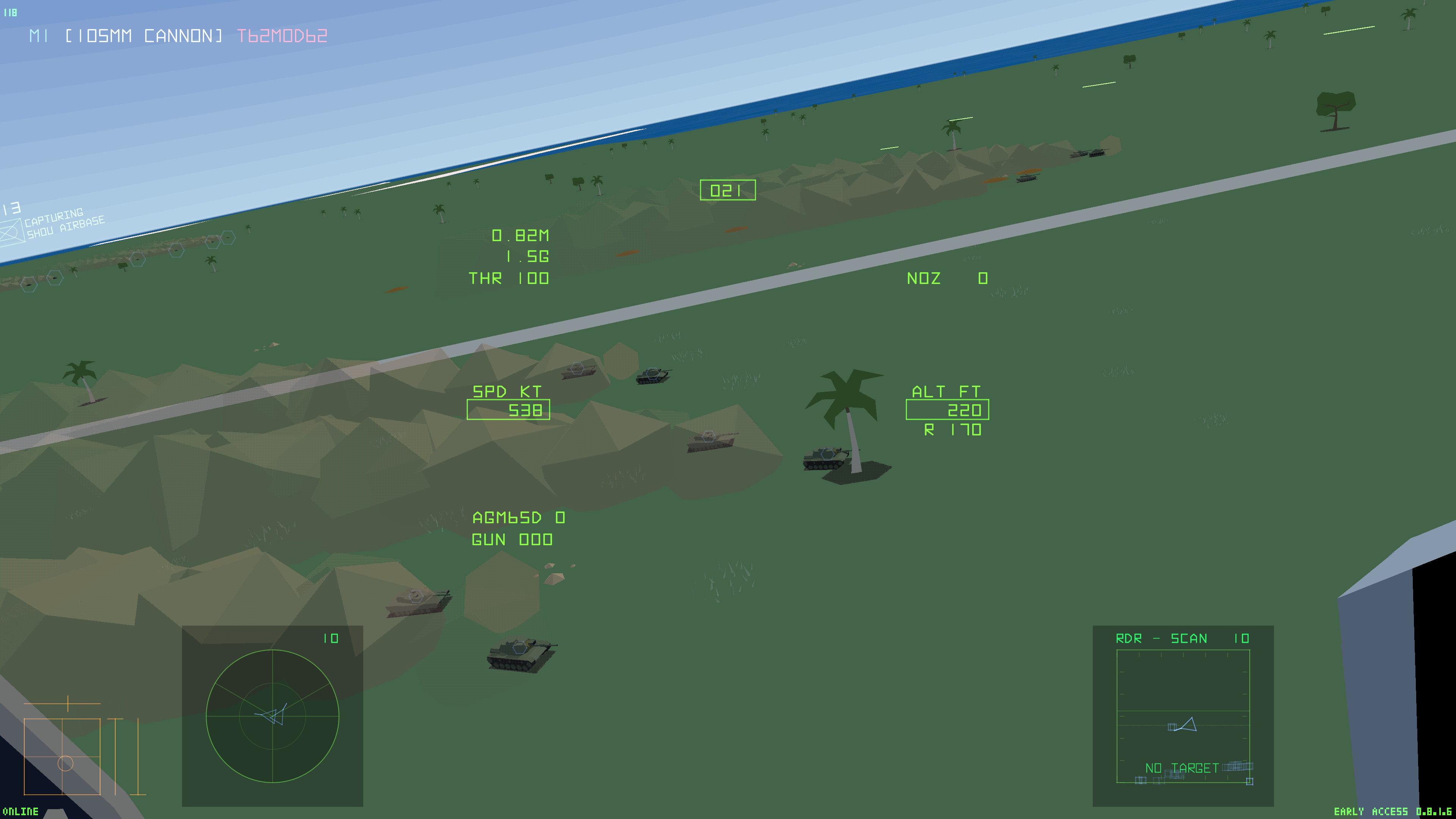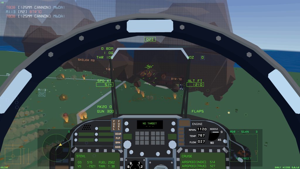 Currently only one aircraft is available to fly and that’s the AV-8B Harrier. It comes with air to air or air to ground loadouts and those loadouts contain a mix of reasonably accurate loads of AIM-9 Sidewinders, MK83 bombs, and Rockeye Cluster Bombs. There’s also the GAU-12 25mm cannon and ammo pod mounted under the aircraft.