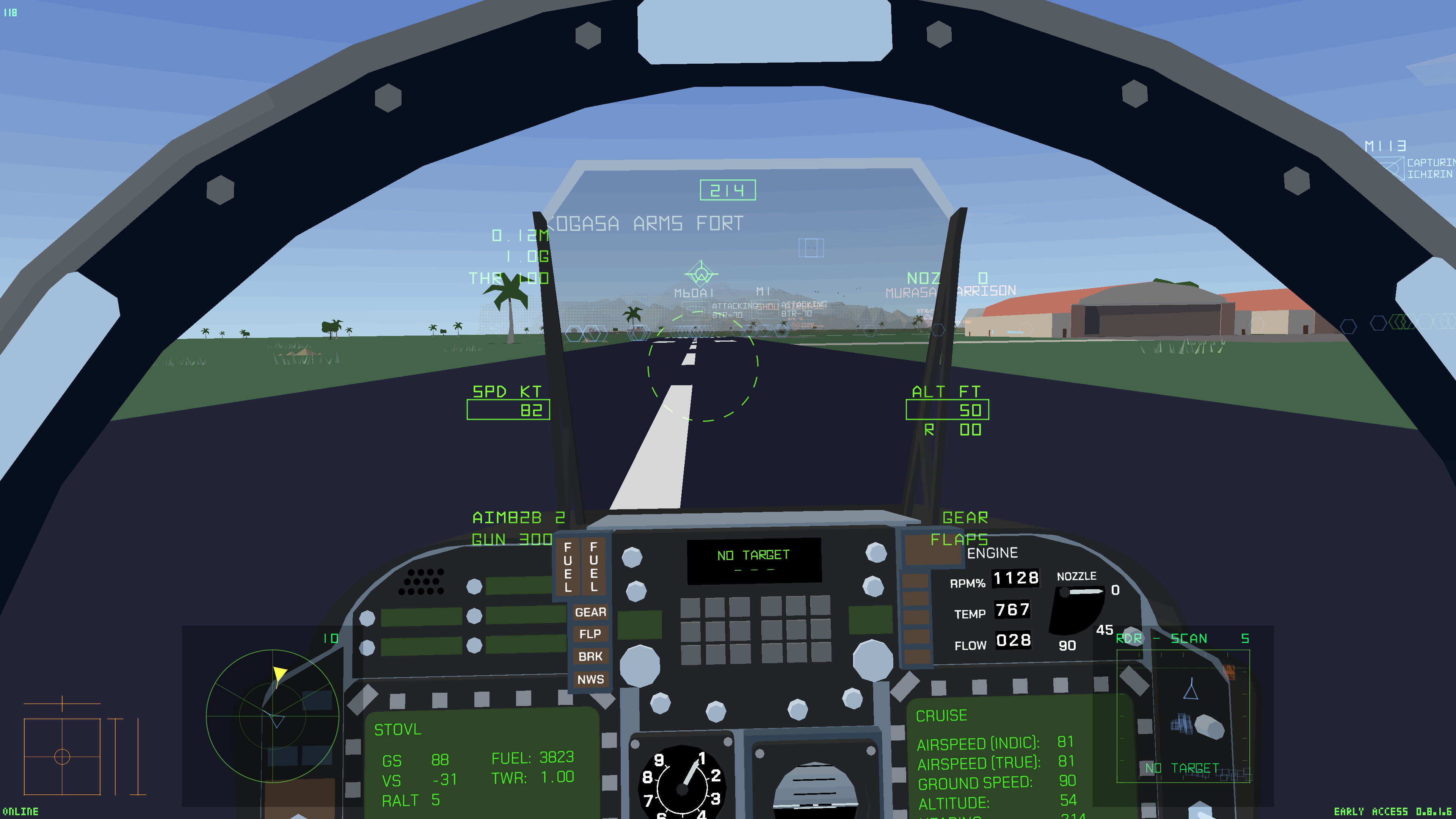Flying the AV-8B is fairly straightforward. The aircraft is a little less responsive than I’d like and I’ve not been able to stall it. It also seems to react a little oddly to my throttle and VTOL axis controls at times (not registering and then registering all at once). Some of that simplicity is by design and likely to ensure that it’s easy to fly when you’re using a gamepad or the mouse.