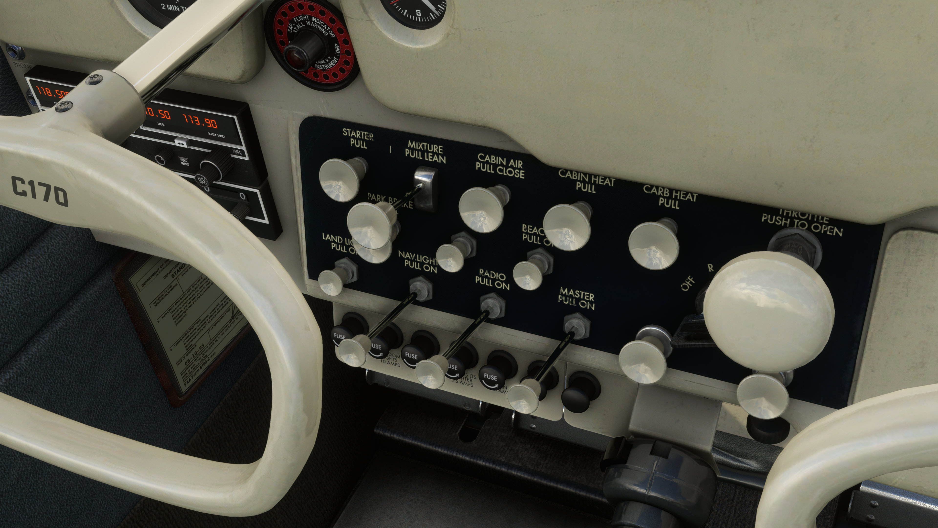 The inside of the cockpit is equally stunning. Everything from lighting to the sharpness of the instrumentation to the dirt around the edges of the windshield are exceptionally well realized. Carenado have leaned towards a clean appearance and indeed their C170 looks like it’s been maintained with the utmost care but it still manages to show off a suitable amount of wear and tear as well. It’s a remarkably tasteful job.
