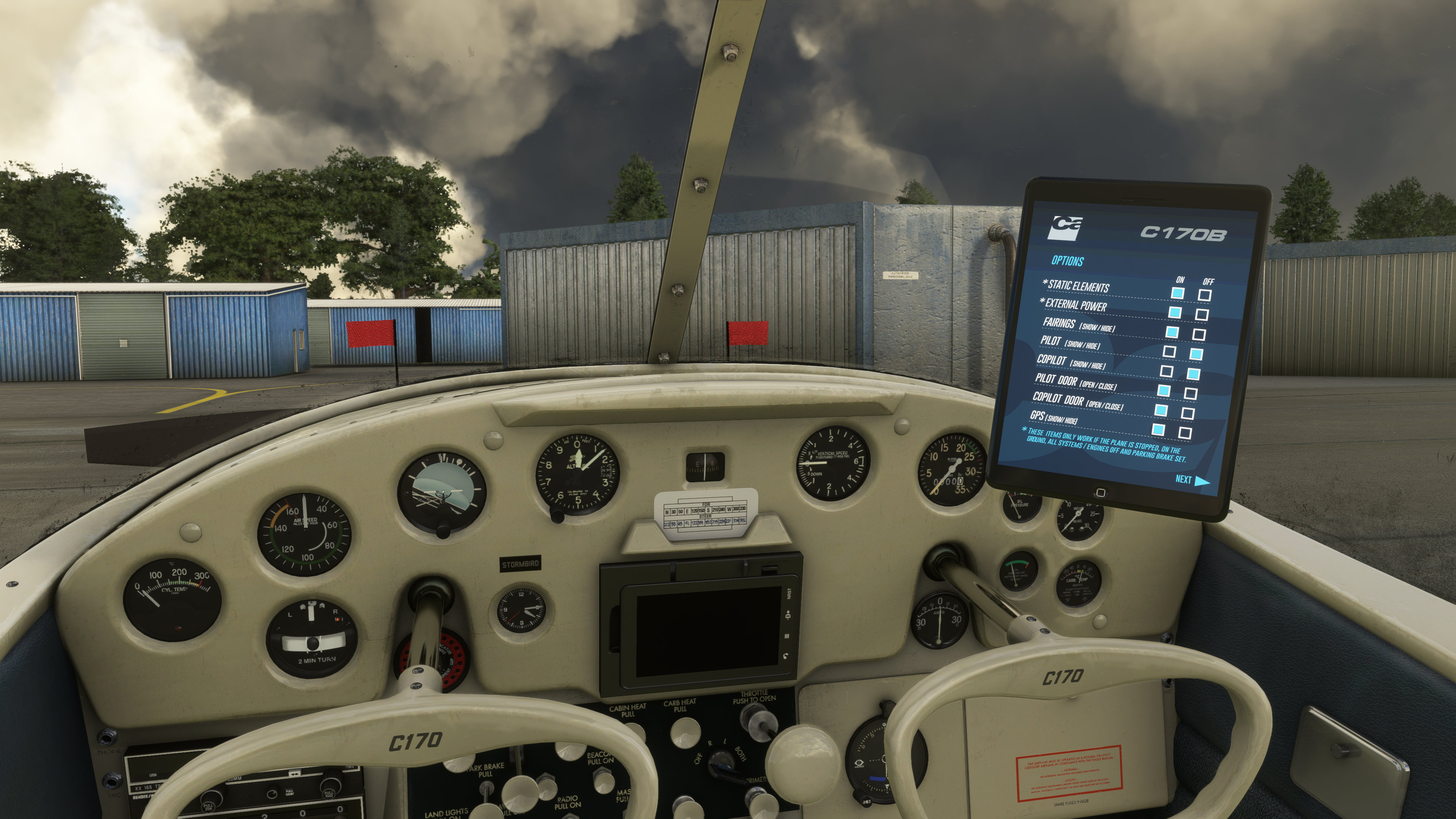 For maximum options, all of this retro styling can optionally be paired with a modern GPS that gives you navigational options including synthetic vision. If you find that to be an anathema to this very retro aircraft, it can be easily hidden via toggle in the cockpit or using Carenado’s tablet which is hidden away in the side pocket. That’s a newer feature that wasn’t available on the aircraft when I first started flying it in August and it looks like Carenado have added this more immersive control system to all of their aircraft. Or at least the ones that I own.