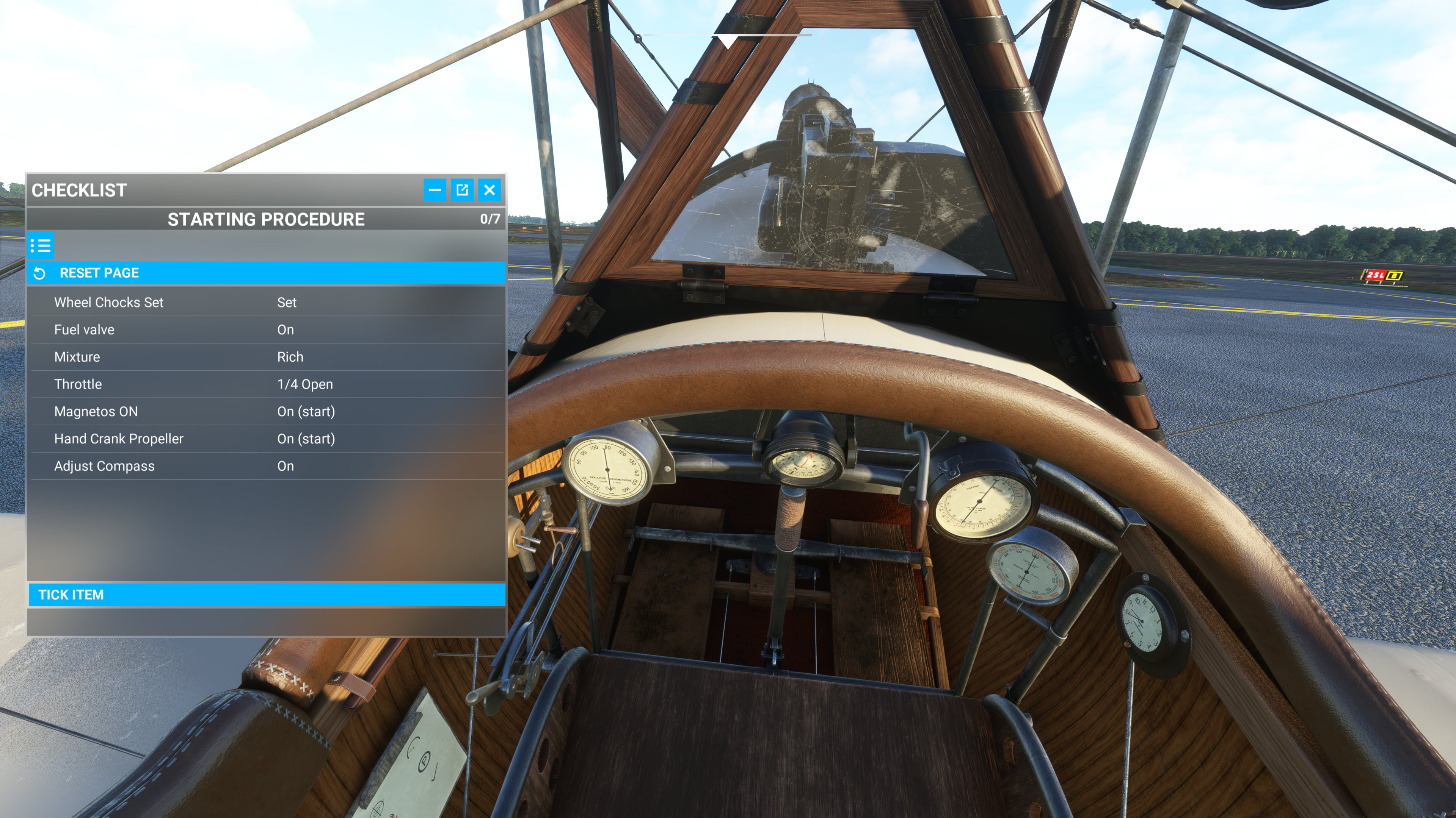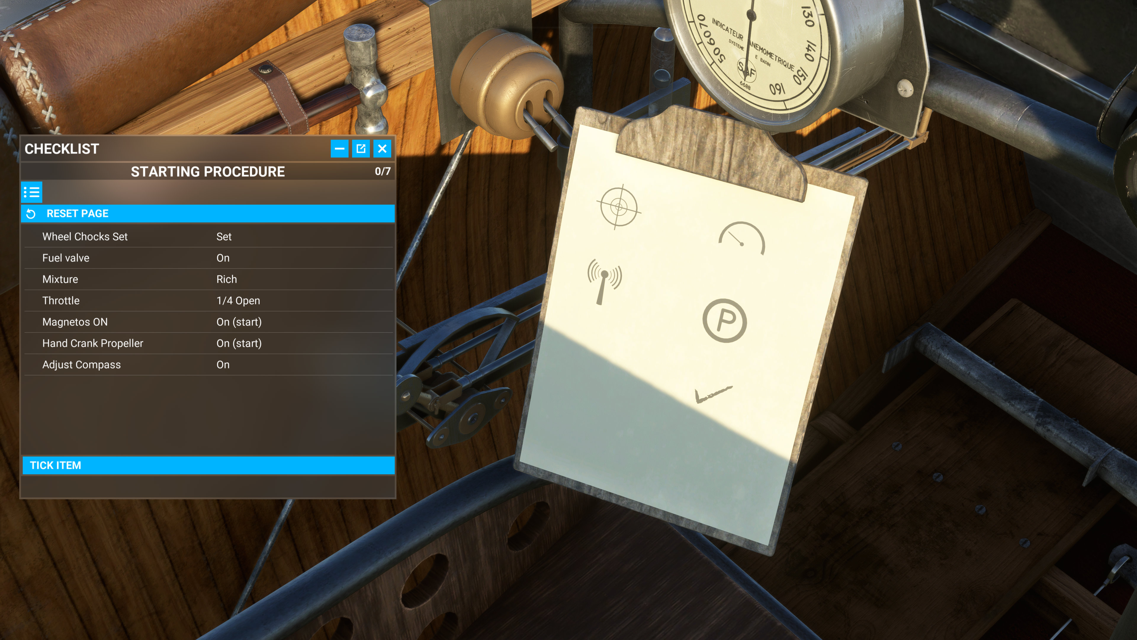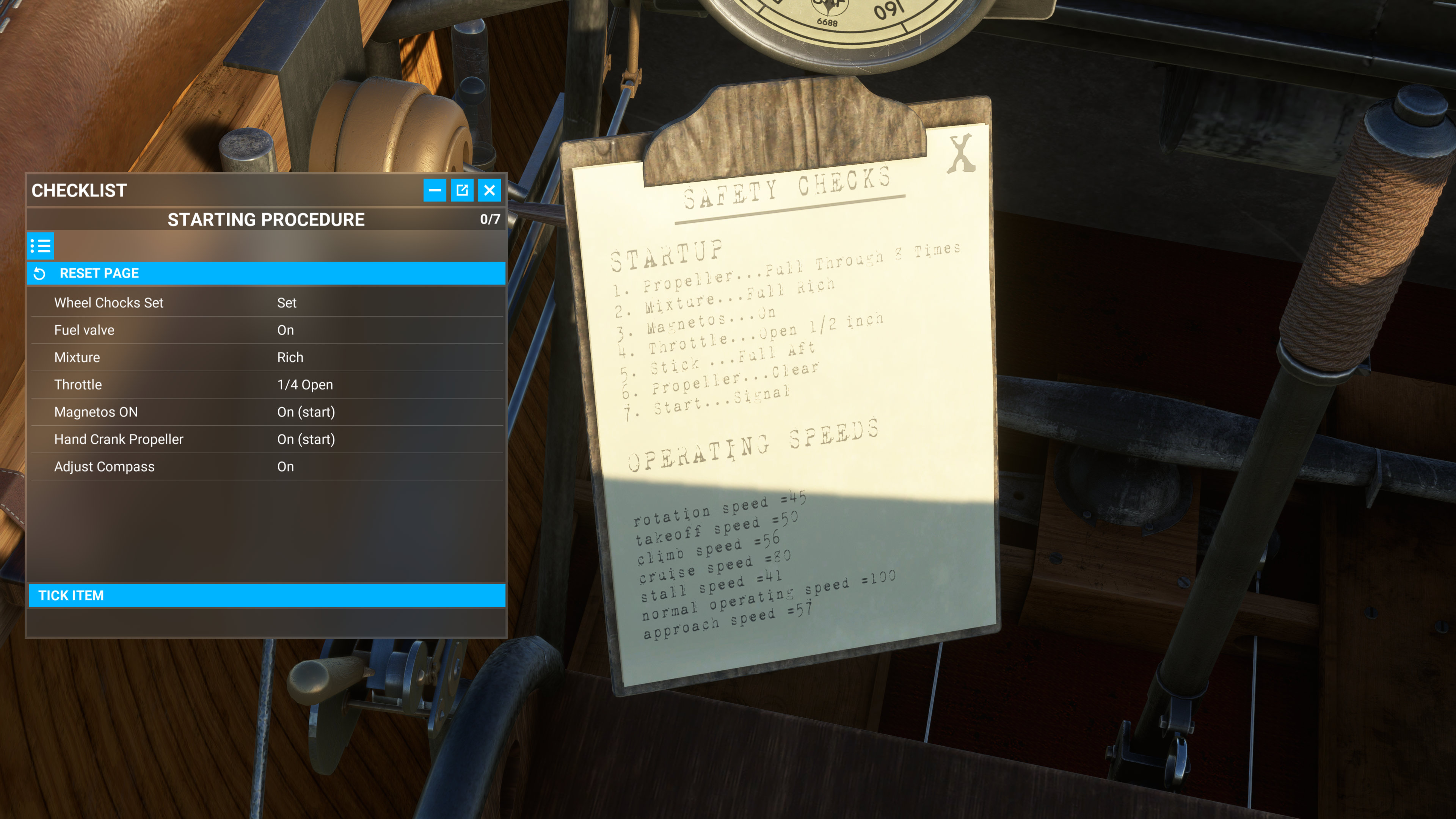 Most of the types’ features are manipulated by a wooden clipboard with notes on it. This will let you view a start-up checklist as well as configure the wheel chocks, speed instrumentation, machine guns, and hide/unhide the radio.