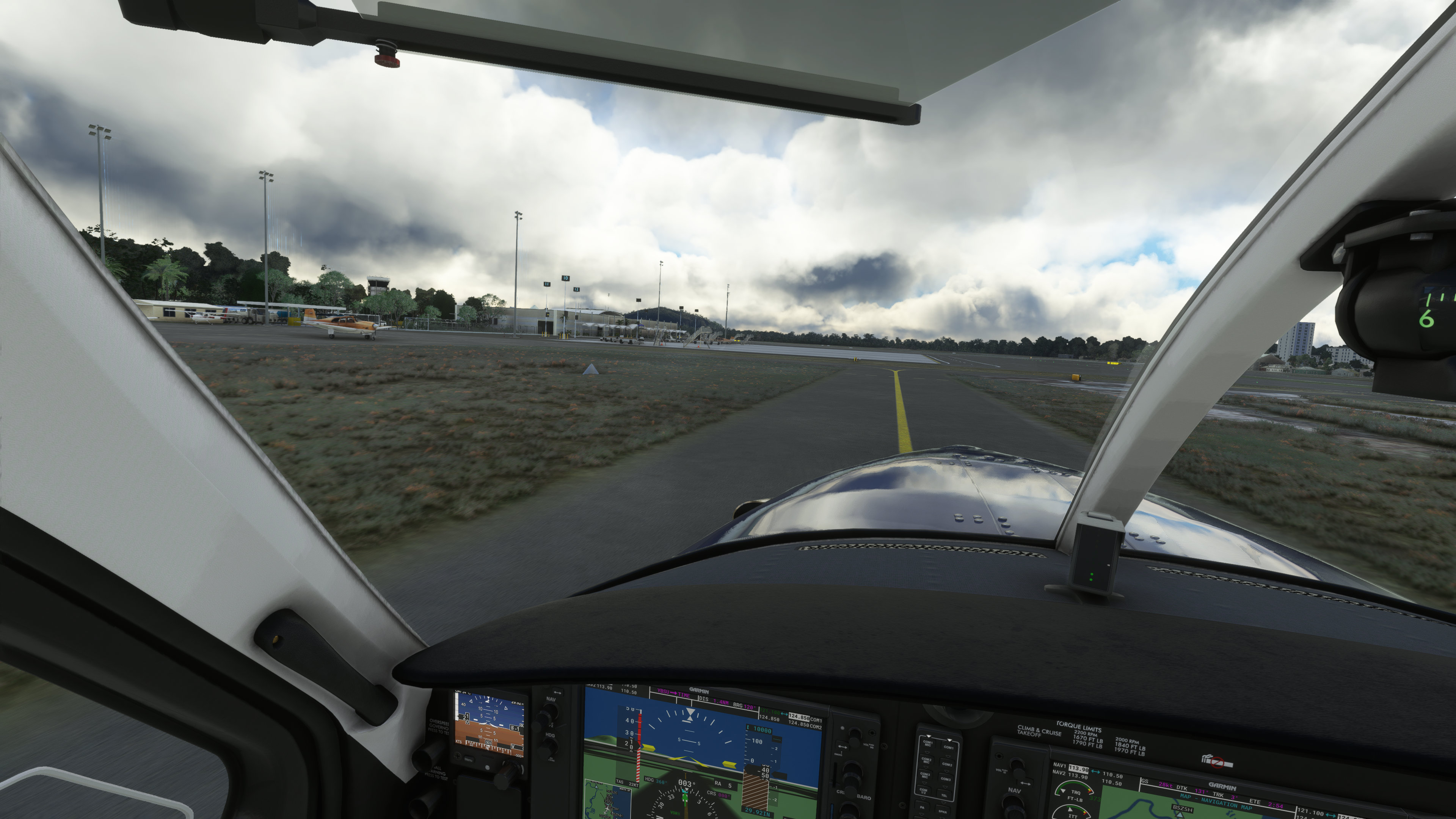 After I had the engine and all systems up and running, it was time to get clearance from the tower and then proceed on to taxi and takeoff. The tower cleared me to taxi to runway 13 which was a bit of a taxi. That gave me a chance to get a feel for how the aircraft handles on the ground which to me felt very much like the X-Plane 11 version I was used to. Slightly sensitive brakes but otherwise pleasant and easy to taxi.