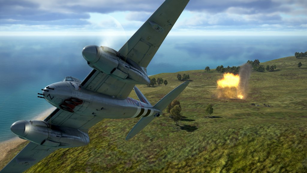 He broke left while I went right and over the water. Unfortunately one of the remaining flak batteries opened up and hit his Mosquito causing damage to the wing, fuel tank, and rudder. He made a turn for home while I dropped my two remaining 500lb bombs on another cluster of targets. These bombs landed perfectly and destroyed the target just a few seconds later.