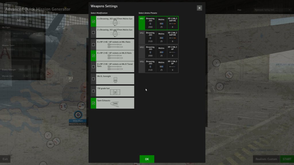 The Mosquito’s primary armament comprises four .303 machine guns and four Hispano Mark II 20mm cannons. The standard 20mm ammo supply gives it 150 rounds per gun. A slight overload option is available bringing it up to 175 rounds per gun. Ample supply!