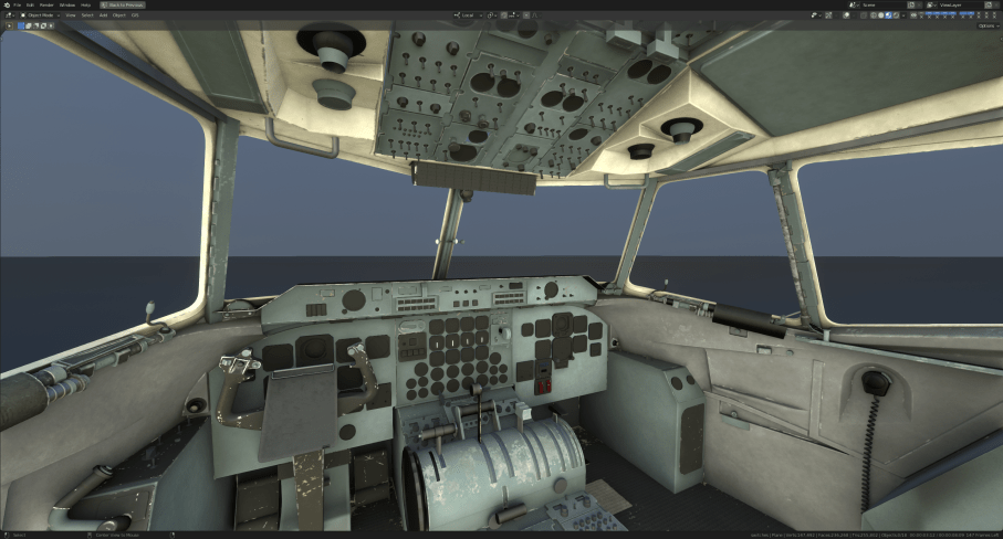 The exterior is complete and fully animated. At this point in time we are refitting the liveries on the aircraft, as we had to do some corrections to the fuselage. The cockpit is modelled and in the process of being textured and animated. This is an arduous task as there are hundreds of moving parts in there and for some of them we have to wait for texturing to be finished before animating them -instrument needles, for example.
