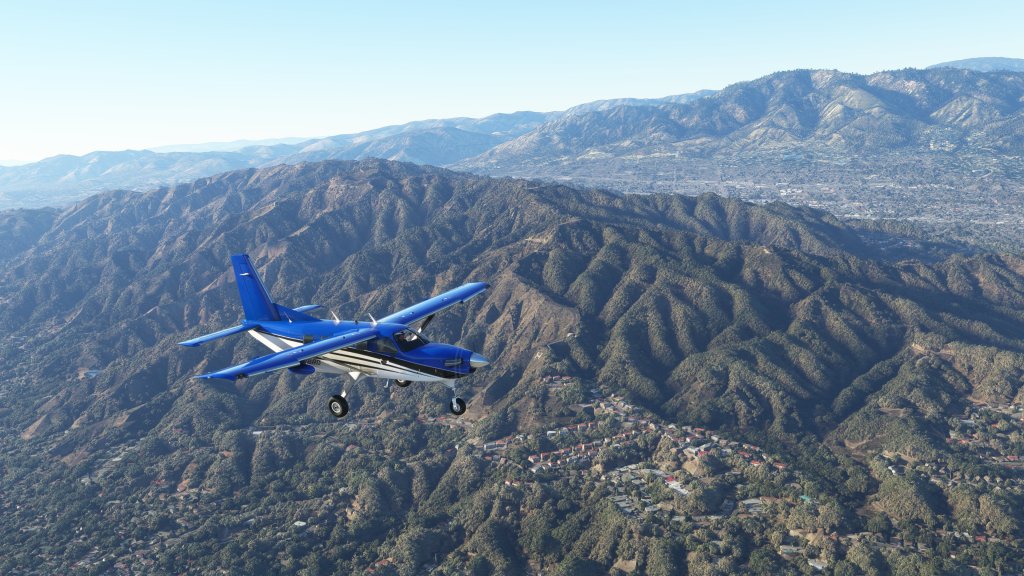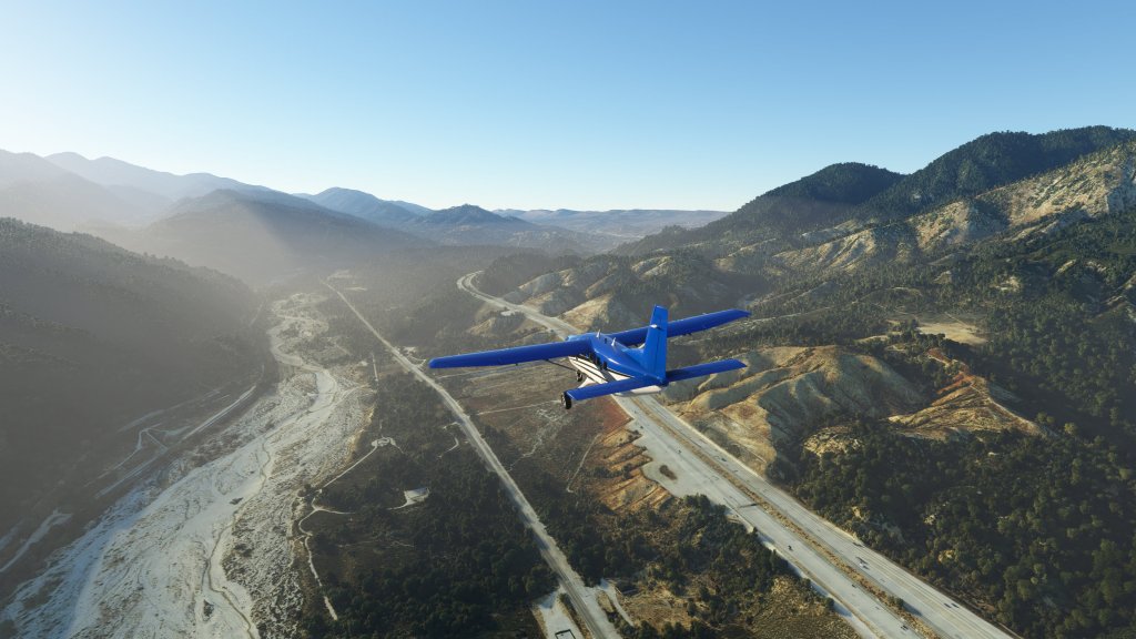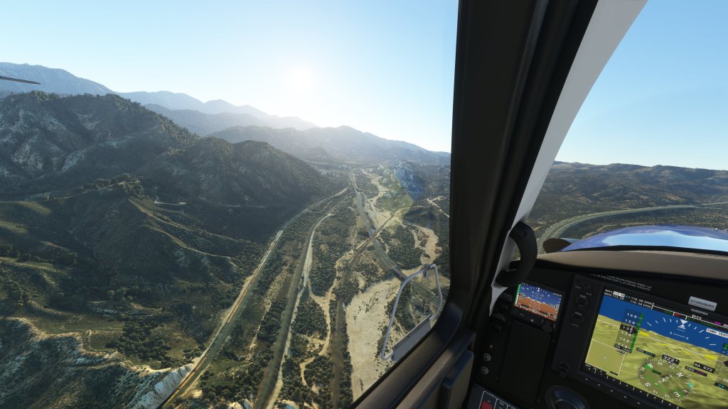 Flying parallel to interstate 10 and 210 I noted the interchange ahead as the road splits off and heads into the mountains as my queue to make a turn to the north. I disengaged the autopilot and flew the Kodiak here for a while as the road made several turns and then headed into the Cajon pass.