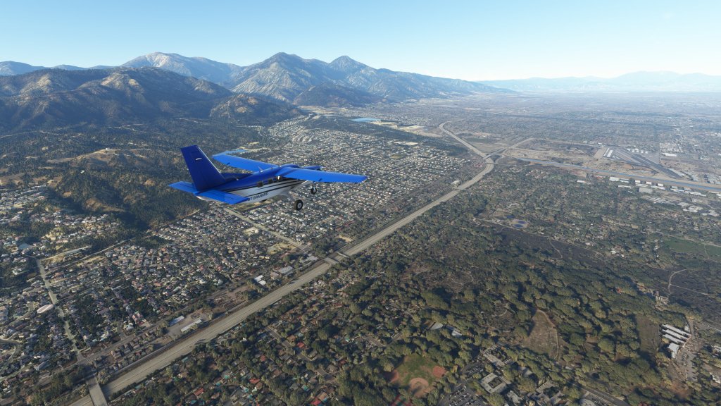 This area is covered extensively with photogrammetry and pretty good photgrammetry at that. Cruising at around 3,000 feet ASL, I could make out individual houses and their unique landscaping in some cases. Malls, intersections, horse racing tracks, and other elements that make up the area were rendered in impressive detail.