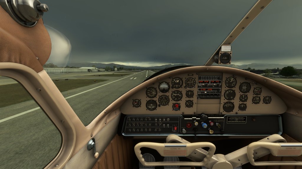 Applying power carefully but steadily, I was able to direct the Cessna 195 in a relatively straight manner down the runway. With some gusting winds (new in SU10) and low clouds, this was going to be a more moody flight but the Cessna 195 seems to be able to handle that relatively well.
