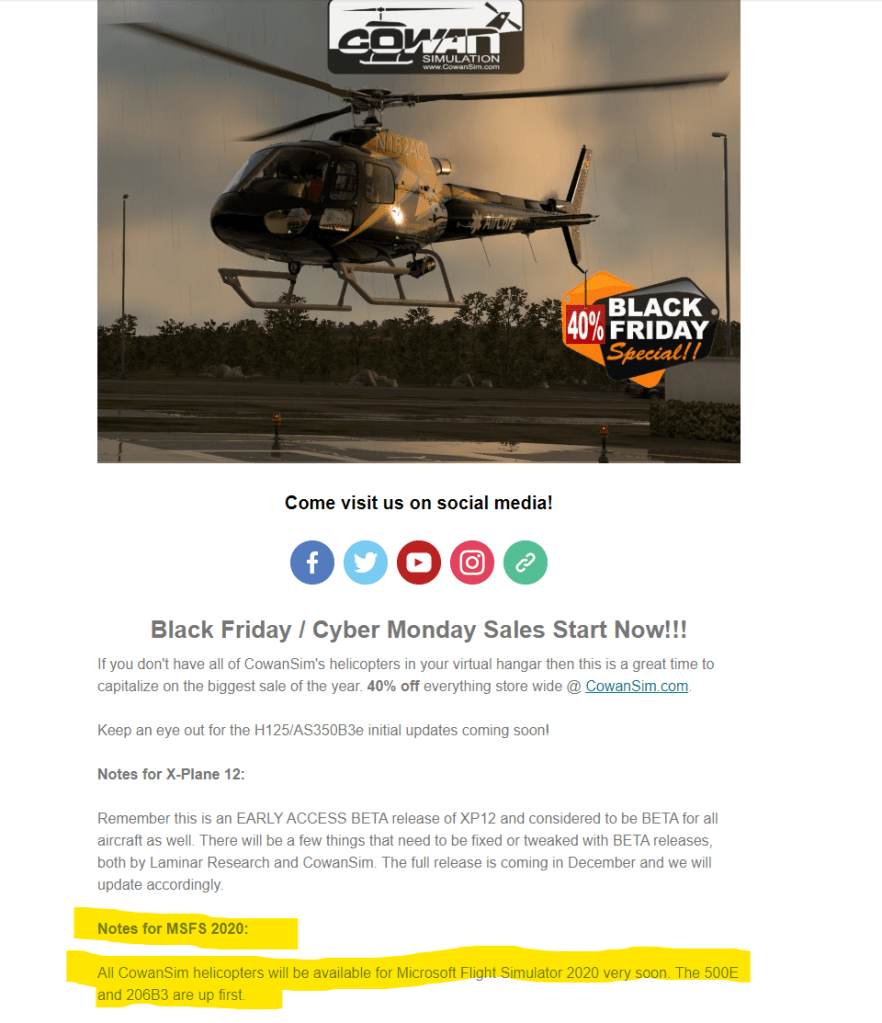 Meanwhile, sales for CowanSim helicopters are now on with 40% off in a Black Friday special over on their webstore.
