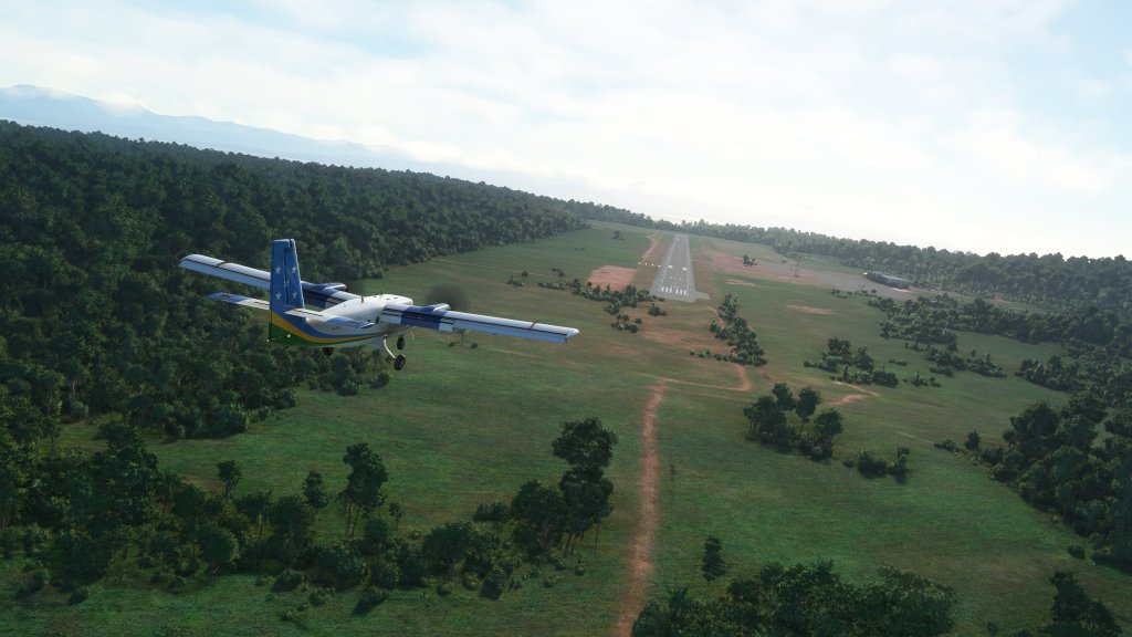 I chose it because of the austere runway and facilities with more than enough room to put the DHC-6 down. It was also not too far away thus making for a great little short flight. Thick clouds on the horizon helped remind that this is a tropical locale with plenty of convective storms to keep things interesting if you fly far enough. Fortunately, the weather was all clear to Nissan.