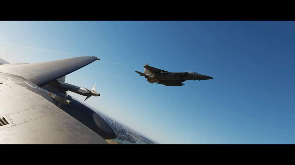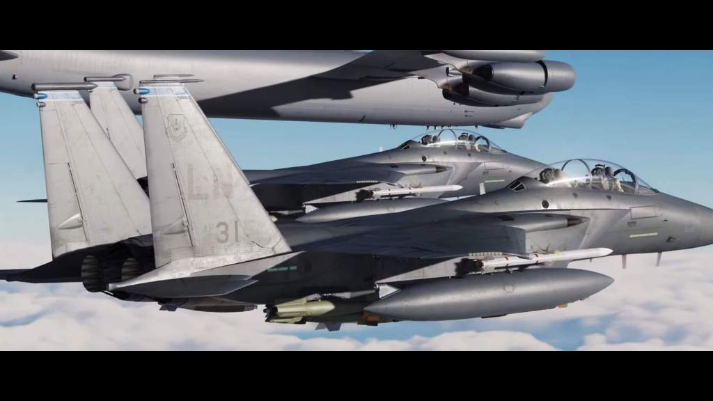 Then we get this beautiful shot of the new AI B-52 asset flying together with some F-15s. Its harder to tell in this shot but in a follow-up sequence we can see that at least some are F-15Es currently in development from RAZBAM.