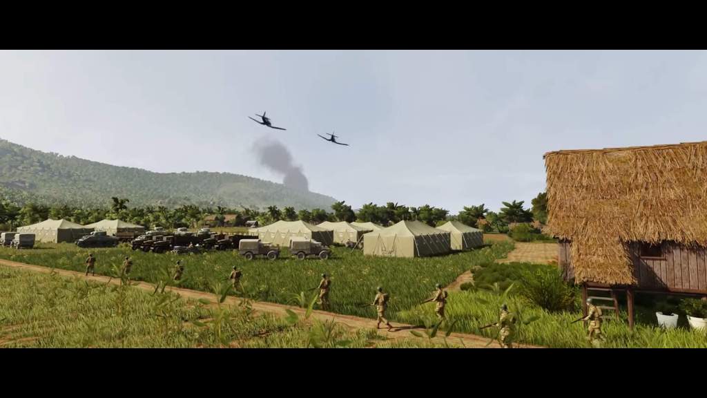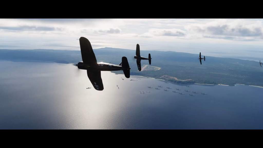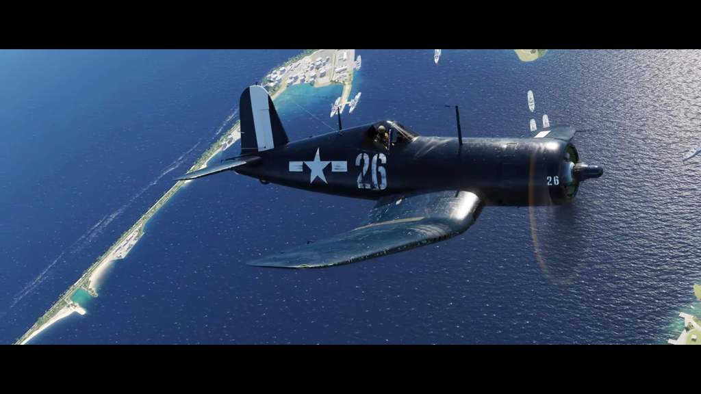 Then we switch gears and the next shot gives us a pair of Corsairs flying over a camp with soldiers on the ground. This may have been shot on the modern DCS: Marianas map but it may also have been done with the DCS: Marianas WWII map – the straw roof building suggests that it is.