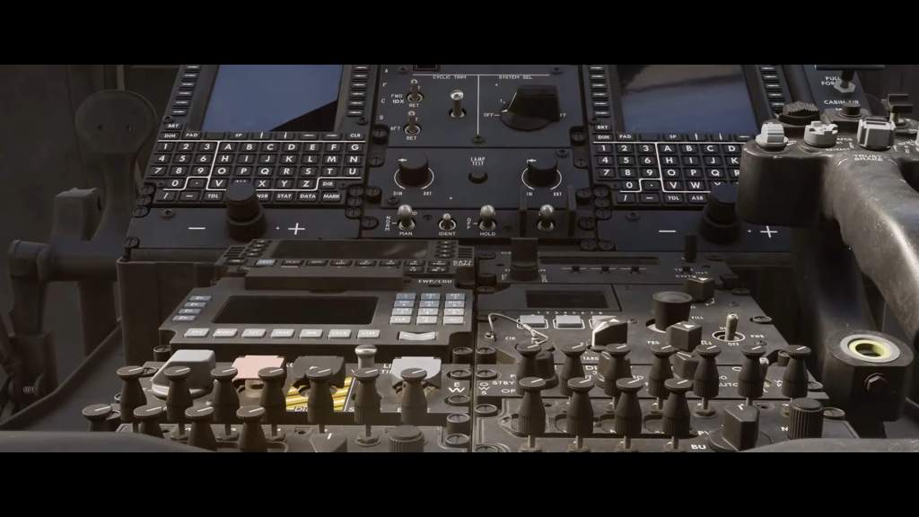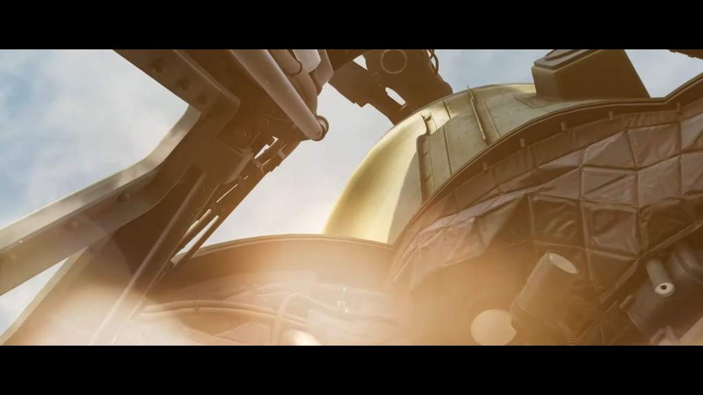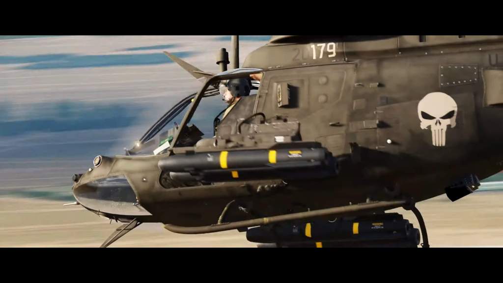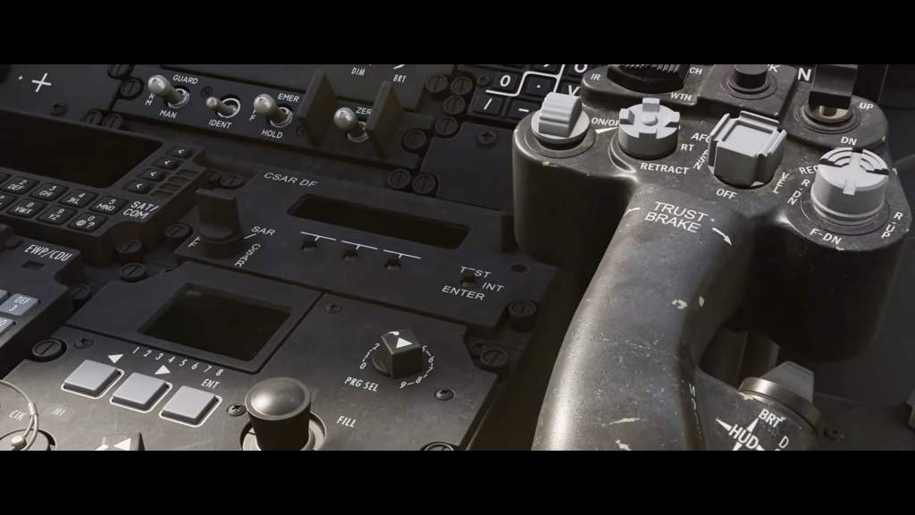 The trailer ends its traditional presentation. But it’s not over because then we see something new. A helicopter cyclic, a relatively modern looking cockpit with a mix of knobs, buttons, and glass. Then a shot up that starts to tie the interior with the exterior together.